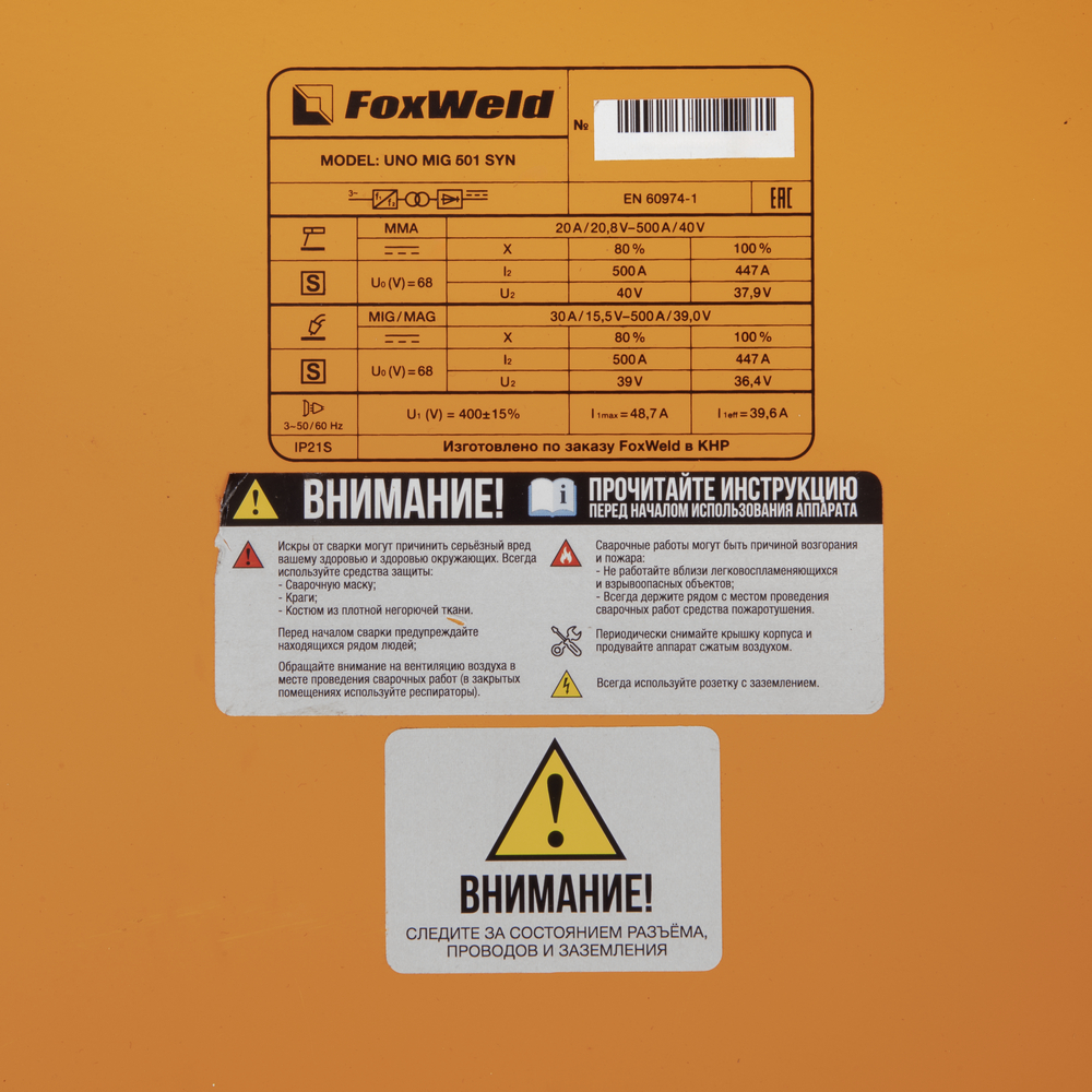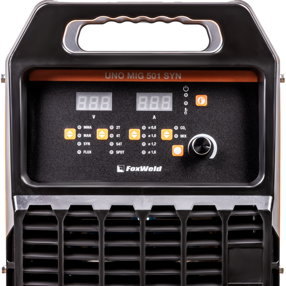 UNO MIG 501 SYN – промышленный/профессиональный трёхфазный инверторный сварочный полуавтомат. Аппарат имеет защиту от перегрузки, индикатор перегрева и неисправности, отличается высокой стабильностью сварки в реальном времени, простым интуитивно понятным управлением сварочными параметрами. UNO MIG 501 SYN с синергетическим управлением предназначен для широкого использования в отраслях по производству металлоконструкций, в сервисных металлоцентрах, при ремонте и восстановлении. Сварочный источник позволяет производить сварку изделий из низкоуглеродистой и легированной стали и алюминия. Максимально надёжная сварочная установка с отдельным 4-роликовым полноприводным механизмом подачи проволоки, двумя мощными ручками на корпусе и колёсами для перемещения идеально подойдёт для рабочего места сварщика. В механизм подачи сварочной проволоки можно установить катушки диаметром D200, D300.ВЫСОКАЯ ПРОИЗВОДИТЕЛЬНОСТЬ: Параметр ПВ (продолжительность включения) 80% на максимальном токе при КПД 85% и 4-роликовый полноприводный механизм подачи сварочной проволоки обеспечивают бесперебойную устойчивую работу сварочного аппарата в течении всего рабочего дня. Это позволяет производить безостановочный сварочный процесс и выполнять работы, которые требуют больших временных затрат, что повышает скорость и производительность.4-РОЛИКОВЫЙ МЕХАНИЗМ ПОДАЧИ: 4-роликовый полноприводный механизм подачи обеспечивает стабильную подачу сварочной проволоки в область сварки без рывков и проскальзываний при использовании горелок с длинным шлангом и при продолжительном сварочном процессе. 4 ведущих ролика механизма подачи способствуют минимальному давлению и деформации на сварочную проволоку, что критически важно для качественной и стабильной сварки алюминия и сплавов.СИНЕРГЕТИЧЕСКИЙ РЕЖИМ УПРАВЛЕНИЯ: Режим синергетики позволяет сэкономить время и получить качественное сварное соединение даже новичку, так как основные параметры подбираются автоматически с возможностью тонкой ручной подстройки сварочного процесса. Синергетику можно отключить для работы в ручном режиме.ФУНКЦИЯ VRD: Функция VRD (снижение напряжения холостого хода) повышает безопасность и исключает риск поражения сварщика электрическим током. Сварочный процесс становится более безопасным в замкнутых пространствах и при сварке в условиях повышенной влажности.УВЕЛИЧЕННЫЙ СРОК СЛУЖБЫ: Сварочный аппарат исполнен в качественном и надёжным корпусе и рассчитан на интенсивную ежедневную эксплуатацию на максимальном токе. Источник питания относится к классу профессионального и надёжного оборудования. Высокая культура производства завода изготовителя, надёжные и мощные компоненты аппарата, грамотная и продуманная система отвода тепла, проверенная временем и надёжная схемотехника инвертора на IGBT транзисторах гарантируют жизненный цикл аппарата не менее 10 лет.ПРЕИМУЩЕСТВА:Синергетический режим управления при полуавтоматической сваркеПолуавтоматическая сварка самозащитной проволокой без газаПолноприводный 4-роликовый механизм подачи проволокиРежимы работы горелки 2T, 4T, SP4T, SPOTФункция VRD (снижение напряжения холостого хода)Максимальный ток 500 A в режимах MMA и MIG/MAGЭргономичное исполнение на базе IGBTФункции продувки газом, Burn Back, Soft Start в режиме MIG/MAGРегулируемые функции Arc Force и Ho