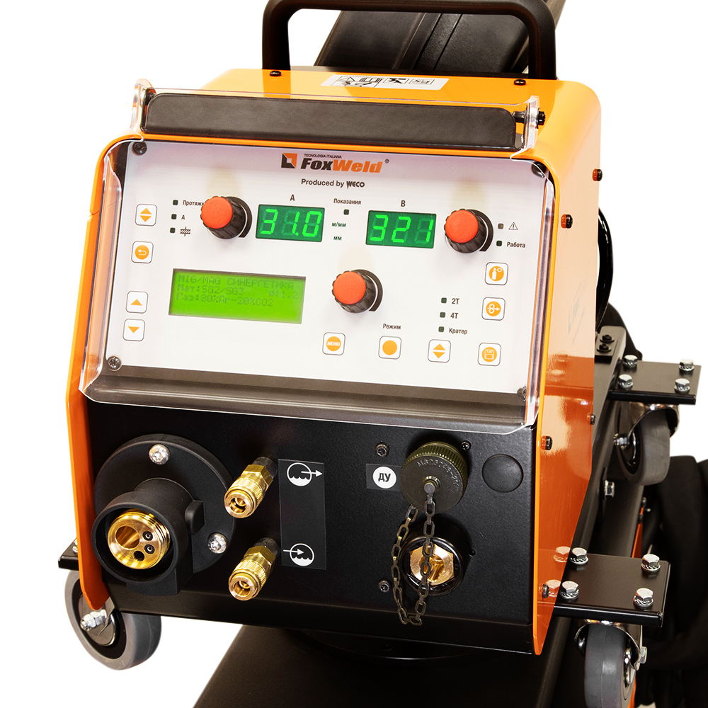 Сварочный полуавтомат FOXWELD WECO MIG 327 AC/DC DP — многоцелевой многофункциональный аппарат 7в1, идеальное решение для задач малого и среднего производства.  Модель WECO MIG 327 AC/DC DP охватывает все области применения: учебные центры, машиностроение, авиастроение, нефтехимия, промышленность. Полноценный аргонодуговой аппарат TIG AC/DC в едином исполнении со сварочным полуавтоматом MIG позволит сократить время на обучение персонала, освободить пространство в рабочей зоне и быстро выполнять различные проекты. Выполнив сложную сварку корня шва в режиме TIG, ускорьте производительность, используя режим MIG со специальными функциями и синергетикой для заполнения разделки.Аппараты FoxWeld серии WECO собрали в себе опыт разработки и эксплуатации профессионального сварочного оборудования, начиная с 1998 г. Все аппараты линейки WECO разрабатываются и производятся в Италии на заводе Corso Noblesville. Высокое качество производства и надежность наших аппаратов позволяют обеспечивать расширенную гарантию на всю линейку FoxWeld серии WECO.ФУНКЦИЯ POWER FOCUS: Концентрация дуги POWER FOCUS позволяет сварщику сфокусировать высокую температуру дуги в центральной части сварочной ванны, избегая таким образом перегрева кромок. Это новая технология сварки деталей из углеродистой стали используется, когда требуется глубокий провар в сочетании с высокой производительностью. Сфокусированная дуга позволяет делать меньшее число проходов для заполнения стыковых швов.ФУНКЦИЯ POWER ROOT: Функция вместе с синергетическими программами оптимизирует холодно-капельный перенос металла для получения высокого качества сварки корневого шва углеродистых и нержавеющих сталей, в том числе аустенитных. Технология обеспечивает улучшенную форму шва при сварке тонких деталей и при выполнении вертикальных швов с большим зазором.ФУНКЦИЯ HIGH CONTROL: Новая система High Control (Pulse НС) отличается эффективным контролем дуги для оптимизации отрыва капель при максимально сниженной мощности источника. Благодаря работе этой системы сварочная дуга становится более стабильной, не образуются брызги и наплывы, появляется отзывчивость к движению горелки, снижается тепловложение и происходит оптимальное оплавление кромок детали.РЕЖИМ HSL: Этот режим сварки стали и цветных металлов отличается очень короткой и интенсивной дугой, что позволяет достигать стабильного горения сварочной дуги без повышенного напряжения. Благодаря этому процессу не происходит перегрева и усадочной деформации основного материала, как следствие изделие имеет лучшие механические свойства.WECO HAC: Уникальная система WECO HAC (Hybrid Arc Control) обеспечивает плавную и очень стабильную сварочную дугу с превосходных качеством сварного шва и минимальным разбрызгиванием в любых условиях работы. Эта функция подходит для работ в вертикальном и потолочном положении и обеспечивает хорошее проплавление кромок, низкий нагрев и малую деформацию основного металла.ПРЕИМУЩЕСТВА:Сварочные процессы: MIG/MAG (SYNERGY, PULSE, DOUBLE PULSE), TIG AC/DC (полноценный со всеми настройками), MMA, GOUGINGСпециальные функции в режиме MIG/MAG: POWER FOCUS, POWER ROOT, HIGH CONTROL, HSLСпециальные функции в режиме TIG: Q-START, Q-SPOT, DYNAMIC ARC, MULTITACK, MIX AC/DC, EXTRA FUSION, BALANCE AC5 функций в режиме MMA: Hot Start, Arc Force, AntiSticking, DYNAMIC ARC, VRDВозможность подключения двух механизмов подачи (опционально)Расширенная синергетика для режимов TIG и MMAВозможность отключен