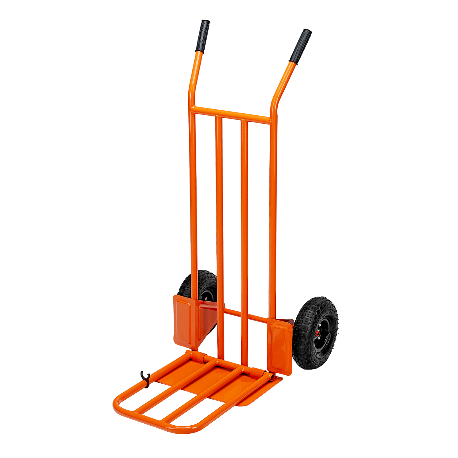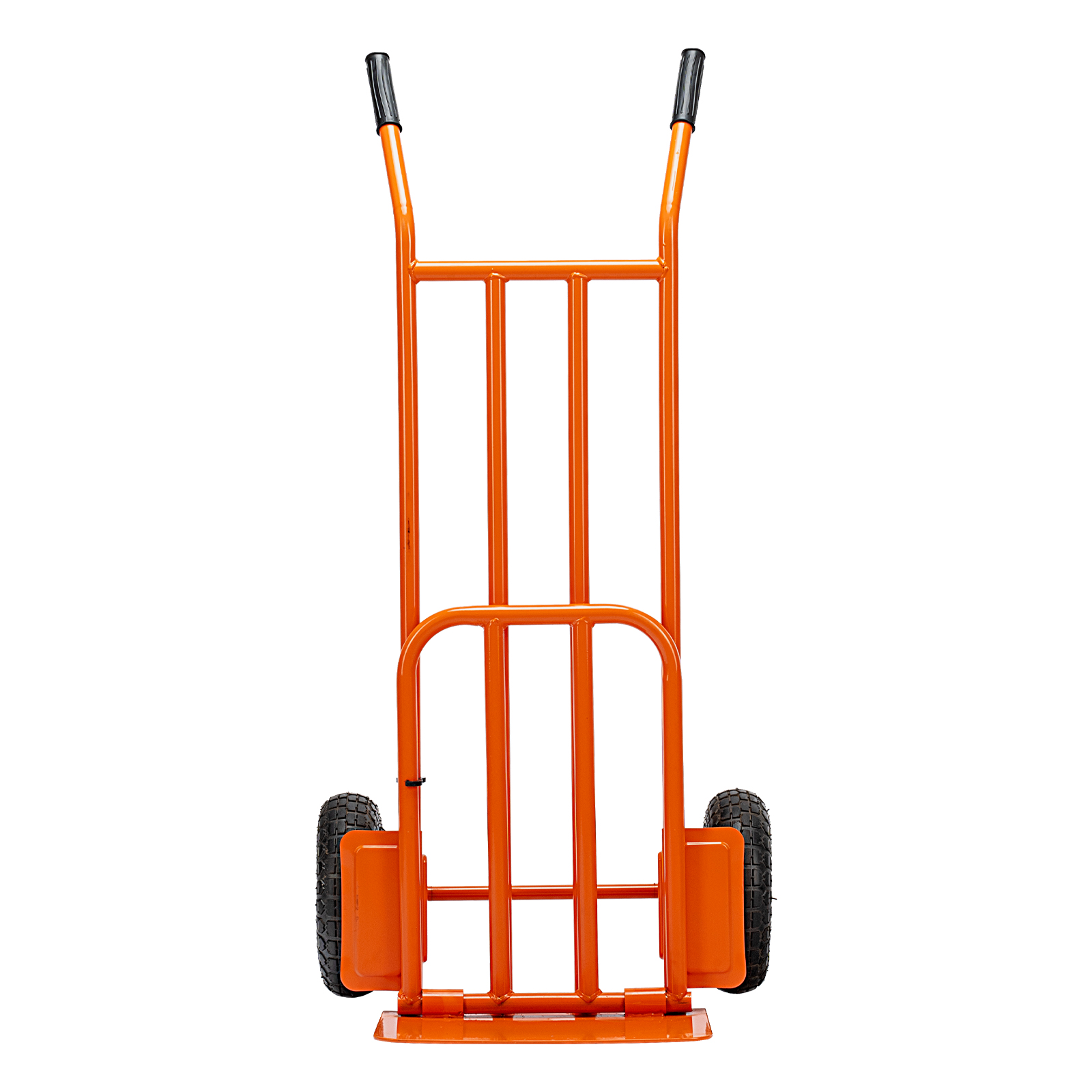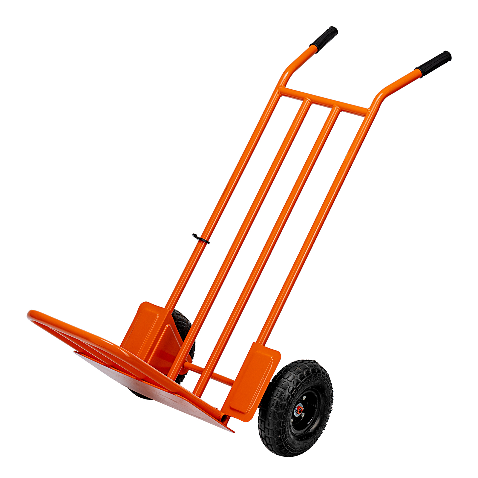 Ручная двухколесная тележка Сибртех 69302 с пневматическими колесами диаметром 260 мм и откидной платформой размером 530 х 400 мм имеет усиленную конструкцию и используется для перемещения крупных грузов массой до 250 кг. Пригодится на складе и на производстве.