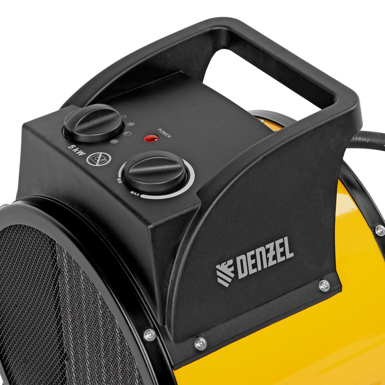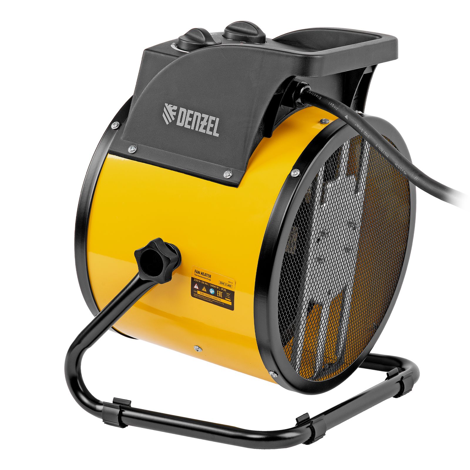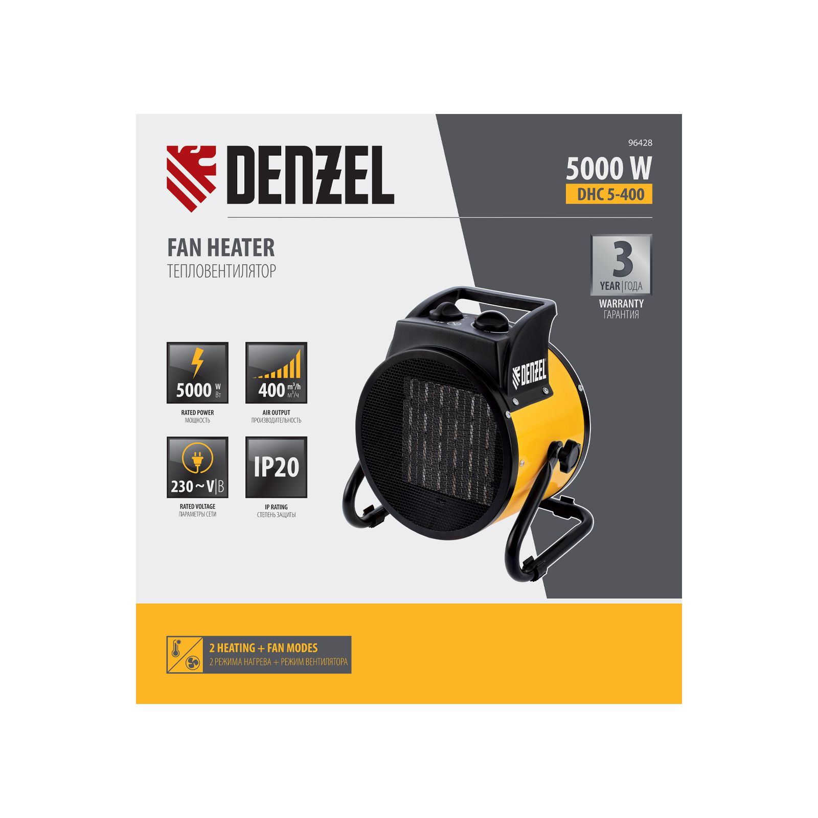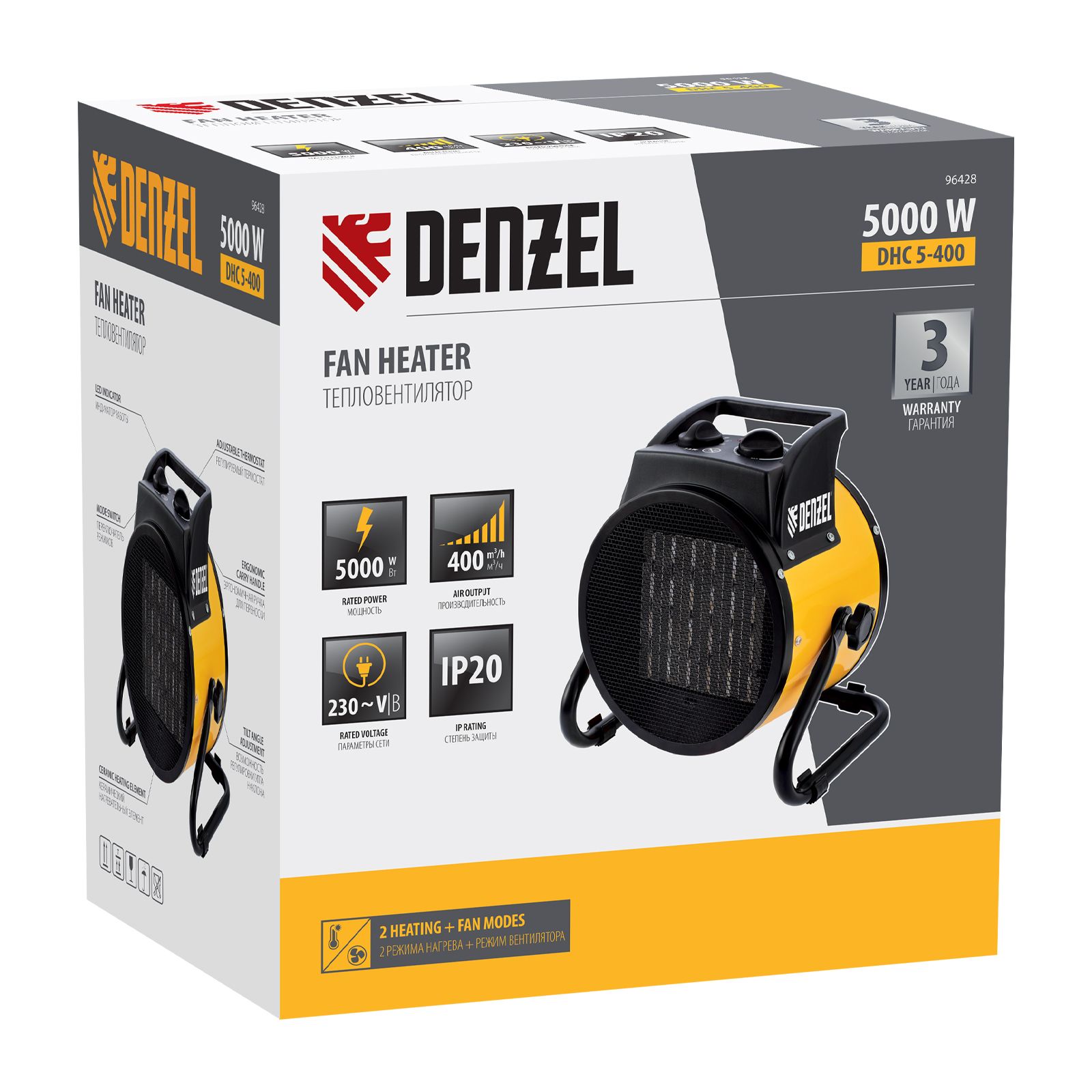 Тепловая пушка (тепловентилятор) Denzel DHC 5-400 96428 с керамическим нагревательным элементом работает на мощности 0,04/3/5 кВт. Пригодится в любую погоду: в холод обогреет помещение, в теплое время года может использоваться как вентилятор. Также пушка применяется во время отделочных работ для просушки поверхностей — окрашенных и оштукатуренных стен, стяжек и т.д. Максимальной мощности 5 кВт хватит для обогрева помещения площадью до 50 кв.м. Работа тепловентилятора не доставляет дискомфорт, безопасна для здоровья людей и животных, поскольку керамический нагревательный элемент не сушит воздух и не выделяет вредных веществ.,Внимание! Тепловая пушка поставляется с установленным кабелем питания и силовой вилкой 230 В / 32 А, для подключения используется силовая розетка 230 В / 32 А (обычные бытовые розетки не рассчитаны на мощность 5 кВт).