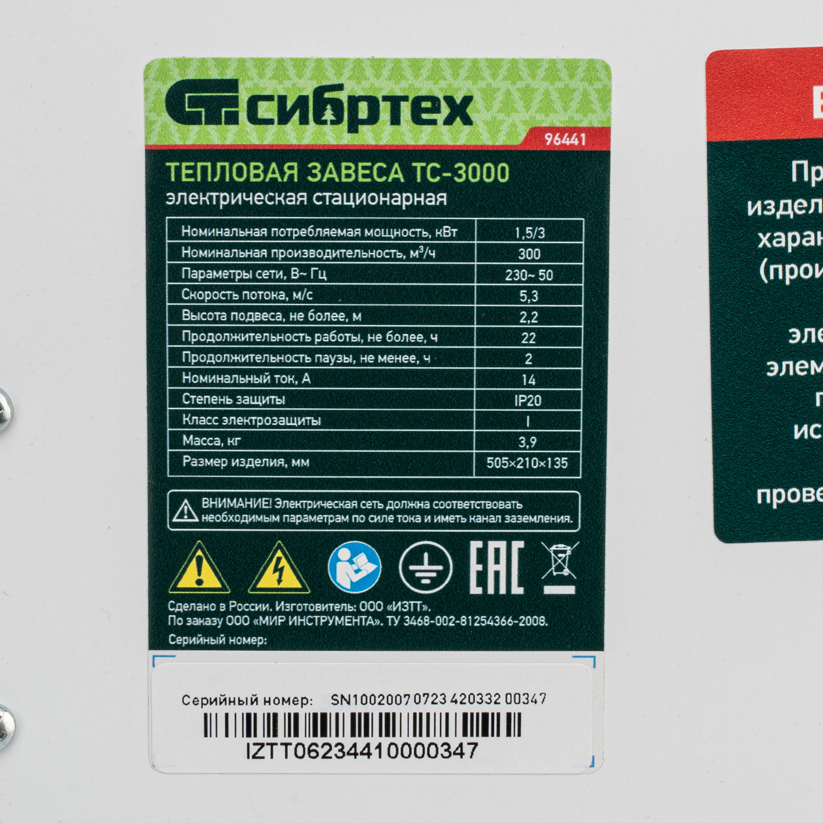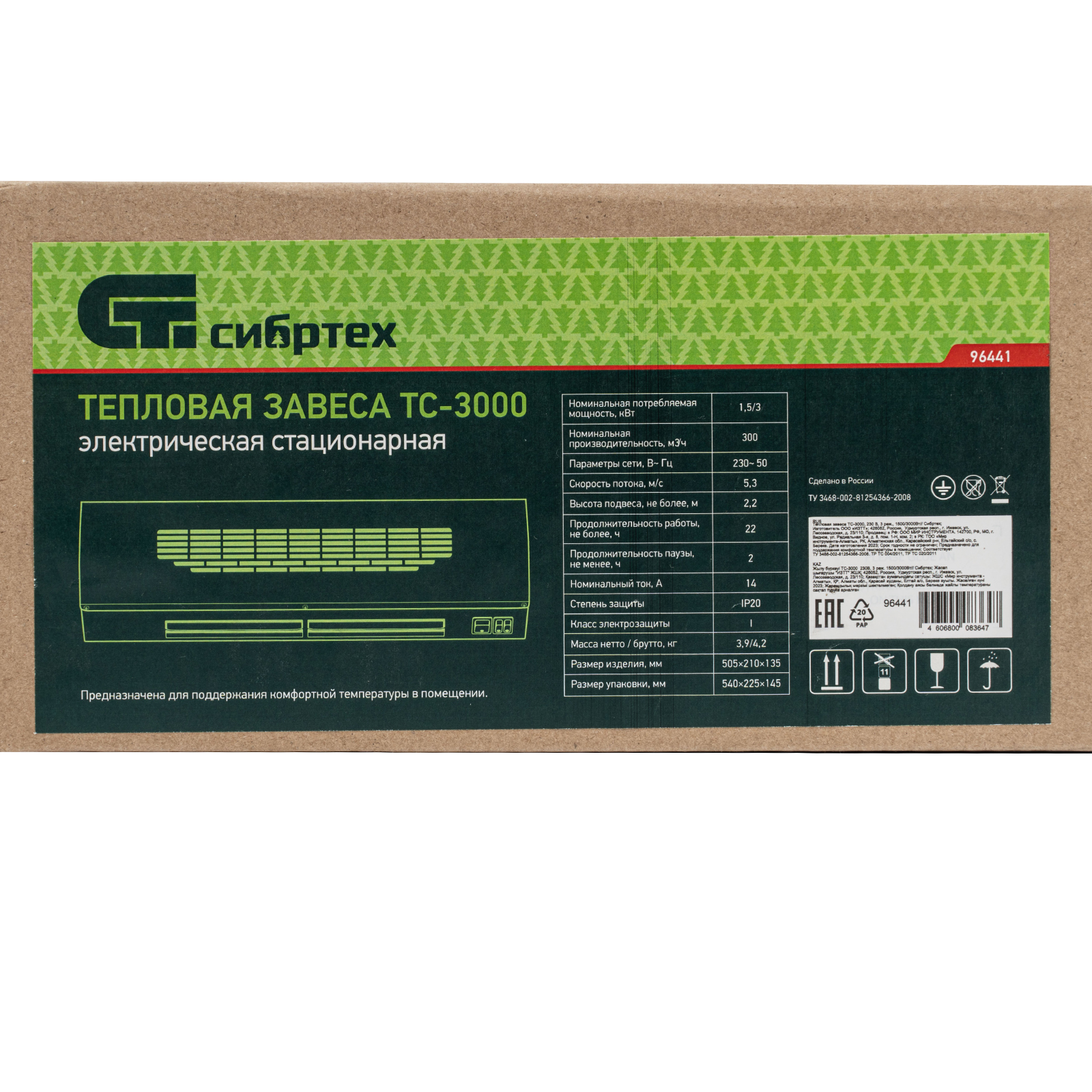 Электрическая тепловая завеса (тепловентилятор) Сибртех ТС-3000 96441 работает в 2 режимах: на мощности 1500 и 3000 Вт. Создает узконаправленный воздушный поток, позволяющий разделить различные климатические зоны, например, отделить воздух в помещении от воздуха снаружи. Устанавливается над оконными или дверными проемами, расход воздуха составляет 300 м3/ч. Питается от сети 220 В, поэтому подходит для домашнего применения. Игольчатый нагревательный элемент (ститч) обеспечивает быстрый разогрев до заданной температуры. Рекомендуемая площадь обогрева составляет 30 м2.