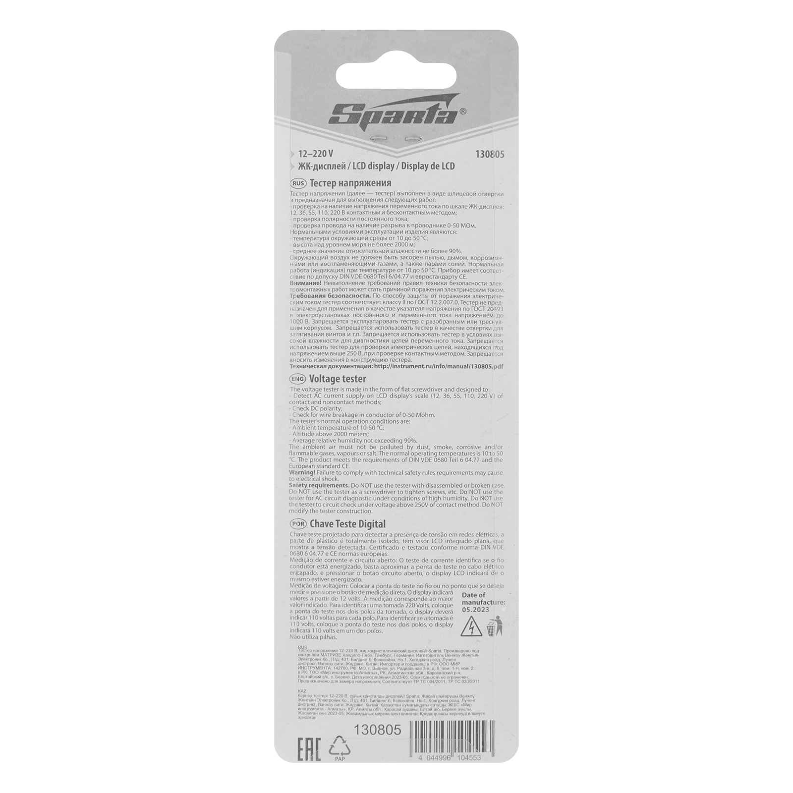 Тестер напряжения Sparta 130805 12-220 В с жидкокристаллическим дисплеем поможет контактным или бесконтактным методом проверить наличие напряжения в сети, полярность батареек и аккумуляторов, выполнить диагностику проводов на повреждения, определить микроволновое и электромагнитное излучение. Индикаторная отвертка подходит для бытового и профессионального применения при проведении электромонтажных работ.