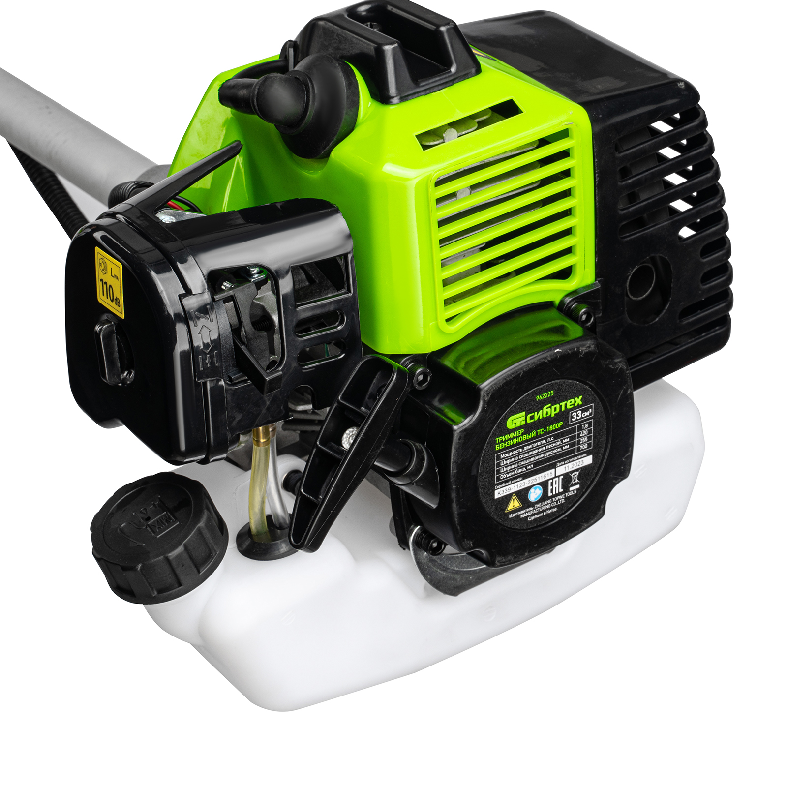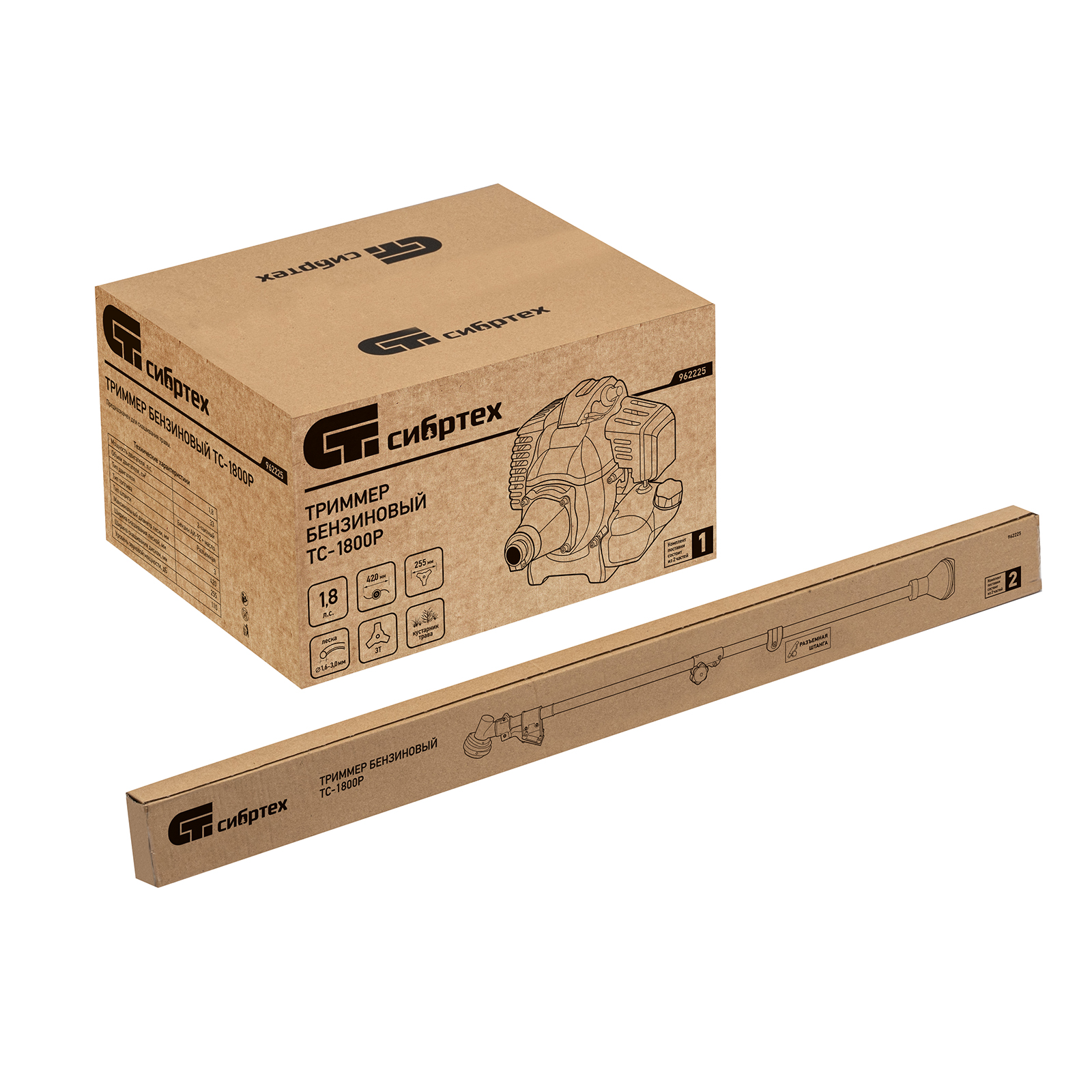 Триммер бензиновый Сибртех ТС-1800Р 962225 с двигателем объемом 33 см3 и разъемной штангой поставляется комплектом, состоящим из 2 частей. Используется для стрижки газонной травы и скашивания растительности. Входящий в комплект поставки трехлопастный нож позволяет легко справляться с густой, жесткой травой и толстыми стеблями сорняков. Оснастка вращается с частотой 9500 об/мин, ширина скашивания леской составляет 420 мм, ножом — 255 мм.