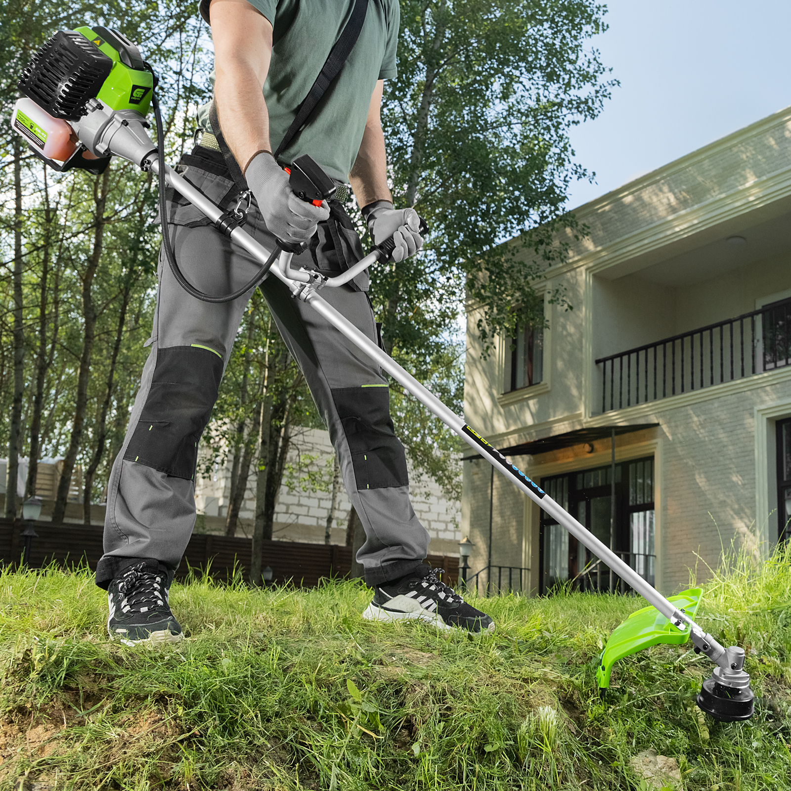 - Комфортная работа — благодаря рукояткам велосипедного типа, плечевому ремню и оптимизированной антивибрационной системе триммер удобно удерживать и направлять.