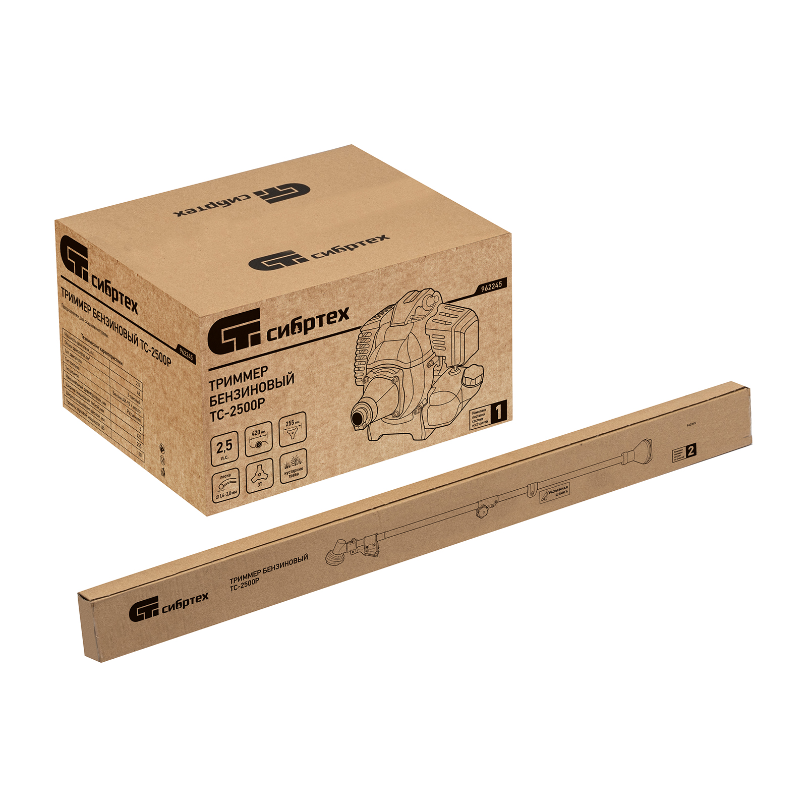 Триммер бензиновый Сибртех ТС-2500Р 962245 с двигателем объемом 43 см3 и разъемной штангой поставляется комплектом, состоящим из 2 частей. Используется для стрижки газонной травы и скашивания растительности. Входящий в комплект поставки трехлопастный нож позволяет легко справляться с густой, жесткой травой и толстыми стеблями сорняков. Оснастка вращается с частотой 9500 об/мин, ширина скашивания леской составляет 420 мм, ножом — 255 мм.