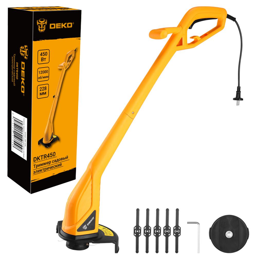Триммер садовый электрический DEKO DKTR450 - компактная модель, удобная для скашивания травы в труднодоступных местах, вдоль заборов, клумб, подравнивания газонов, краев садовых дорожек. Удобное расположение отсекателя режущей лески на защитном кожухе обеспечивает комфорт в процессе работы. Снимите защитную накладку с отсекателя перед началом работы и Вам не придется каждый раз проверять длину лески. Она будет обрезаться самостоятельно.