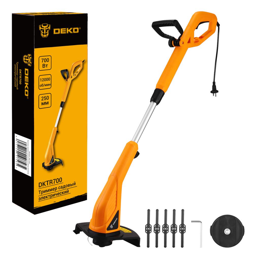 Триммер садовый электрический DEKO DKTR700 - компактная модель, удобная для скашивания травы в труднодоступных местах, вдоль заборов, клумб, подравнивания газонов, краев садовых дорожек. Удобное расположение отсекателя режущей лески на защитном кожухе обеспечивает комфорт в процессе работы.