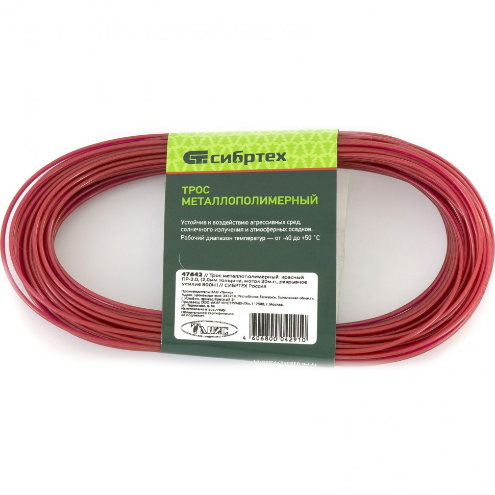 Металлополимерный трос ПР-2.0 Сибртех 47642 красного цвета, толщиной 2,0 мм, в мотке 20 метров, используется для монтажа баннеров и рекламных растяжек, погружения скважинных насосов и датчиков, установки тентов и теплиц, а также в качестве пломбировочного троса. Может выполнять функцию садового шнура для подвязки растений, устройства ограждений, а также применяться в качестве троса для развешивания белья. Благодаря покрытию из пластиката ПВХ-трос устойчив к истиранию, коррозии, УФ-излучению и перепадам температуры, что увеличивает срок его службы.
