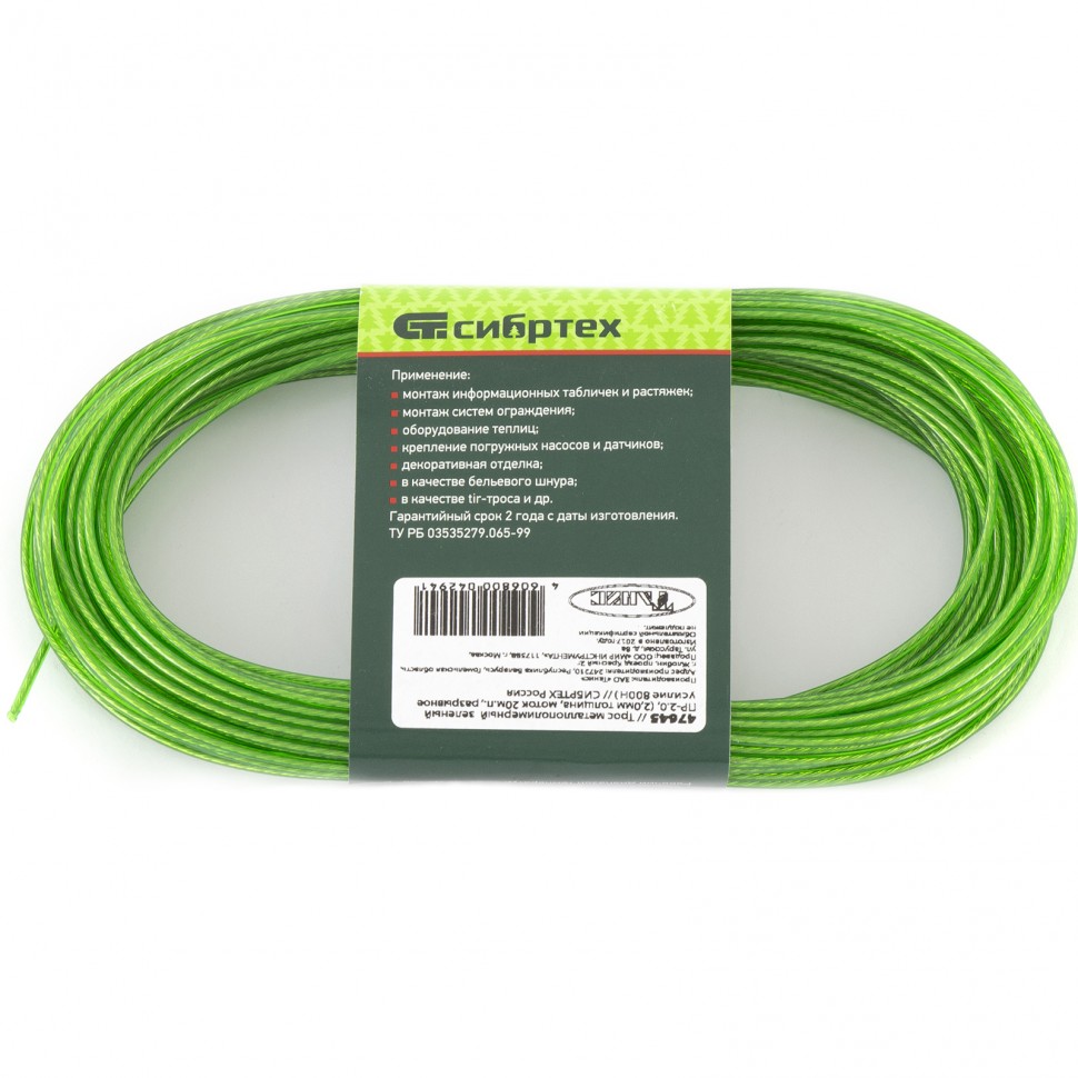 Металлополимерный трос ПР-2.5 Сибртех 47643 красного цвета, толщиной 2,5 мм, в мотке 20 метров, используется для монтажа баннеров и рекламных растяжек, погружения скважинных насосов и датчиков, установки тентов и теплиц, а также в качестве пломбировочного троса. Может выполнять функцию садового шнура для подвязки растений, устройства ограждений, а также применяться в качестве троса для развешивания белья. Благодаря покрытию из пластиката ПВХ-трос устойчив к истиранию, коррозии, УФ-излучению и перепадам температуры, что увеличивает срок его службы.