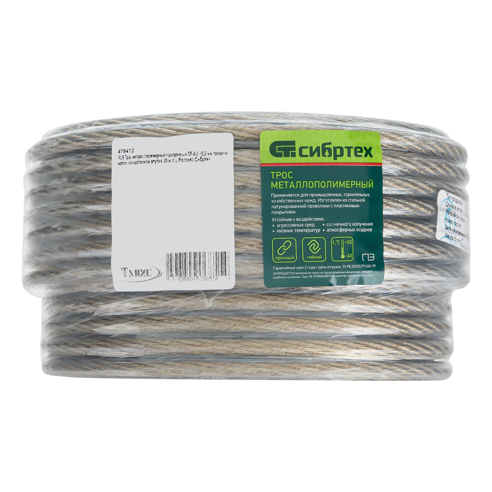 Трос металлополимерный прозрачный ПР-8.0, толщина 8.0 мм, моток 20 метров Сибртех в Уфе