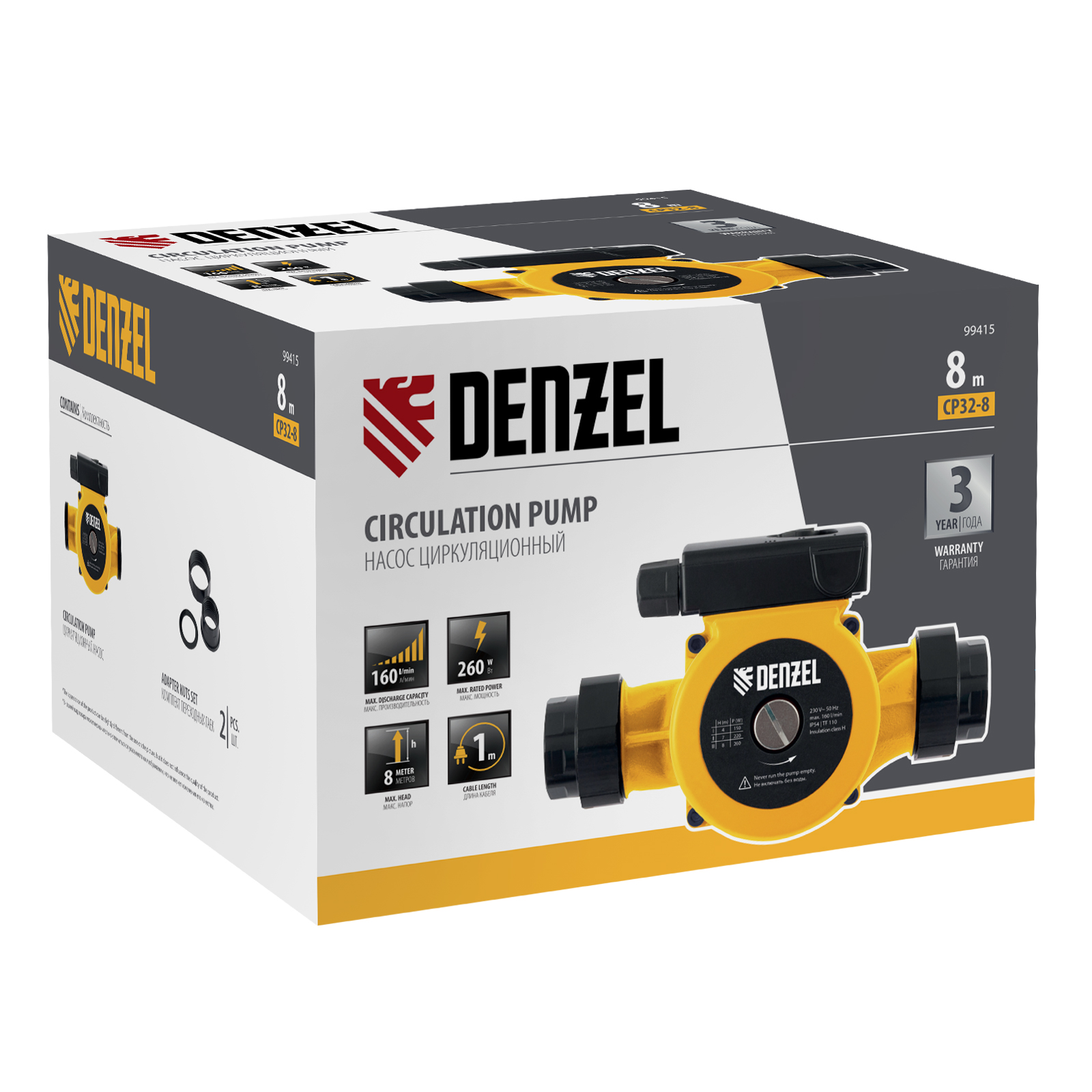 Циркуляционный насос CP32-8, напор 8 м, 160 л/мин, 1 м кабель, монт. длина 180 мм Denzel в Уфе