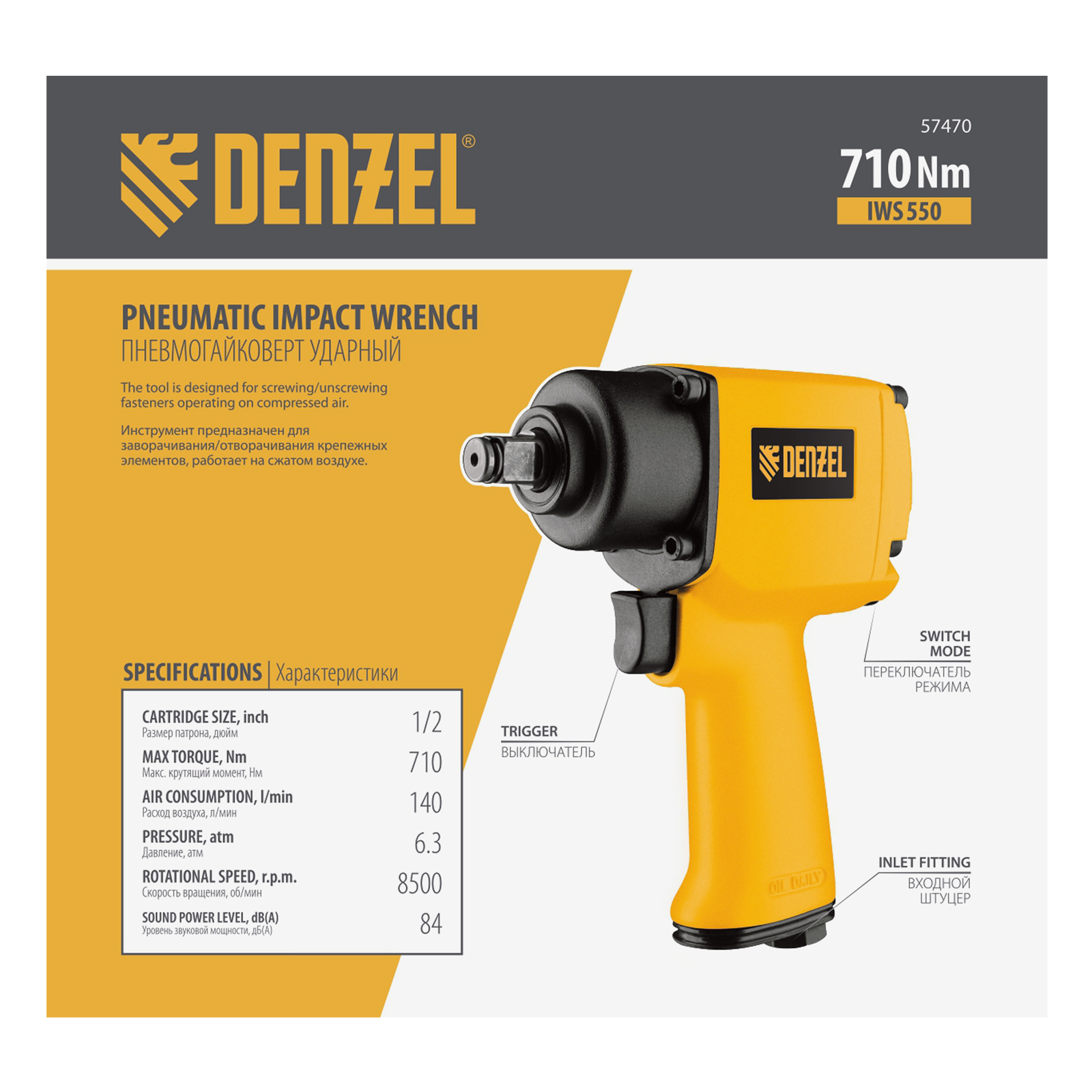 Ударный пневмогайковерт IWS550 Compact, 1/2", 8500 об/мин, 710 Нм Denzel в Уфе