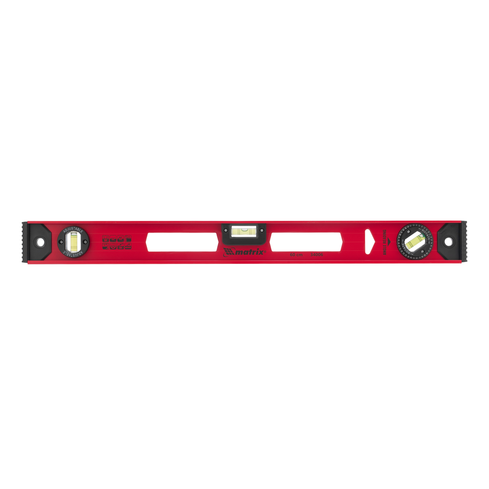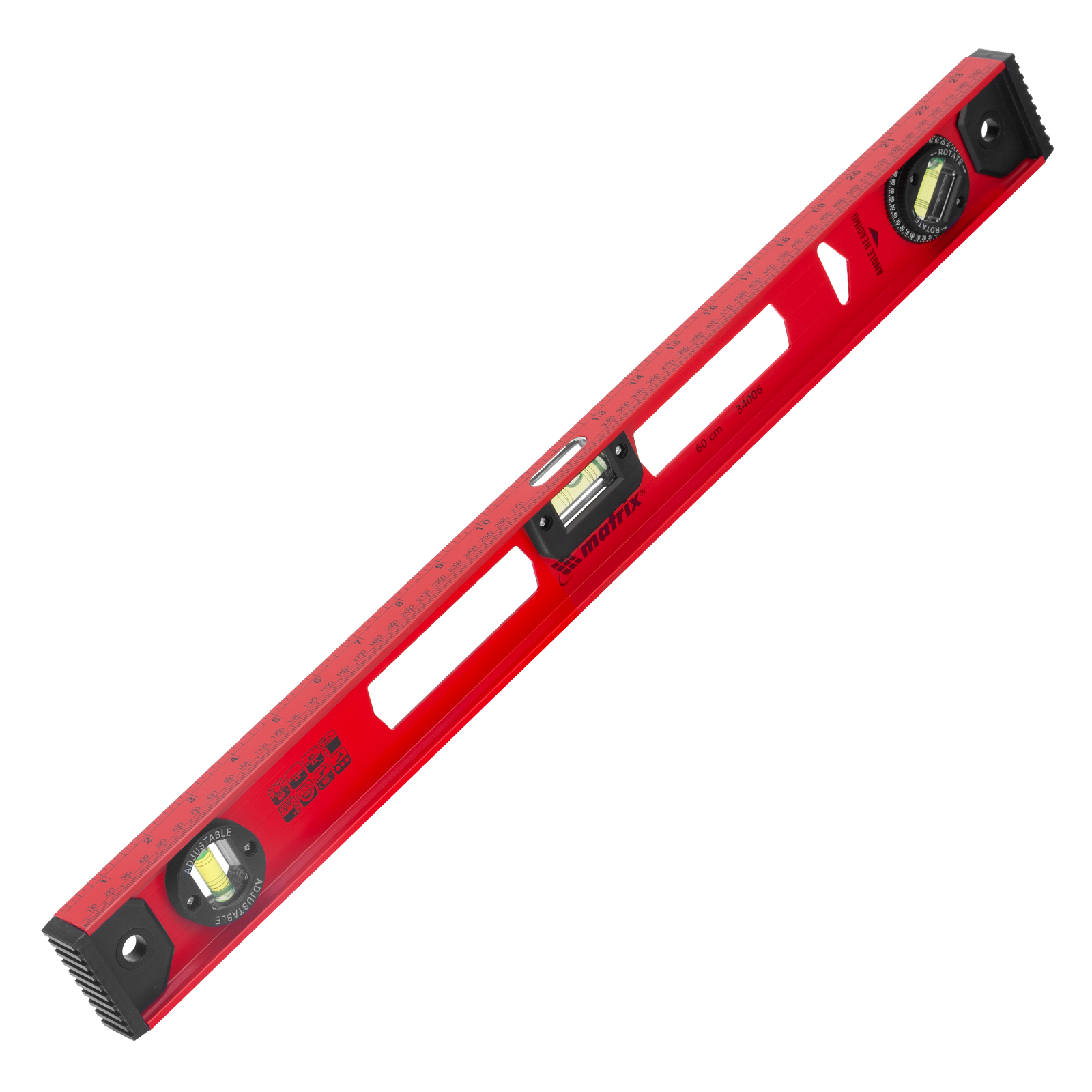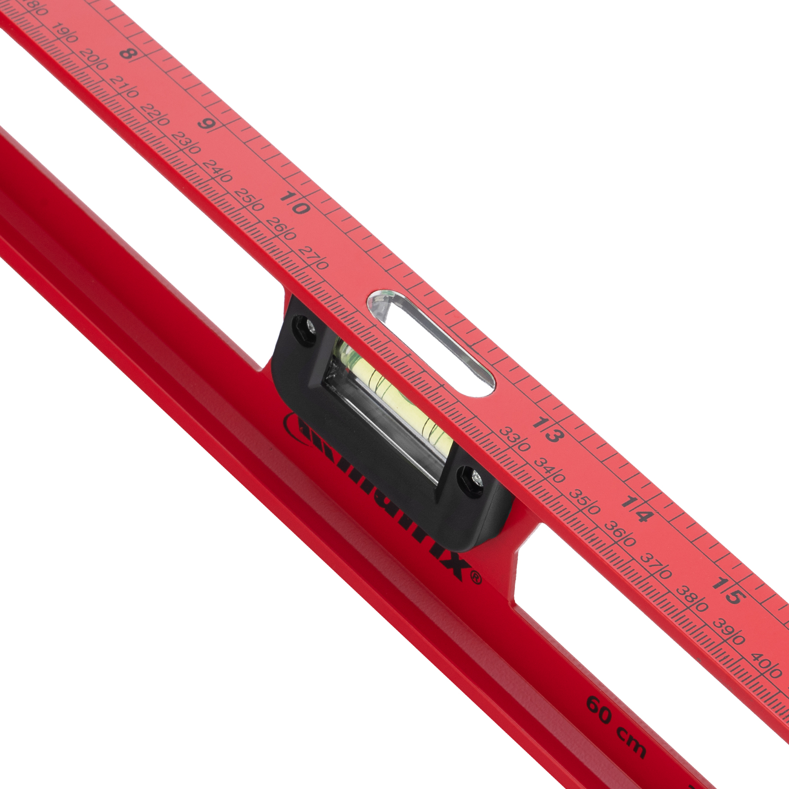 Уровень алюминиевый усиленный Matrix «Рельс» 34006 длиной 600 мм снабжен 3 глазками для проверки отклонений относительно горизонтальной и вертикальной плоскостей. Поворотный глазок уровня позволяет выстроить произвольный угол. Инструмент пригодится строителю, отделочнику, бетонщику и другим специалистам.