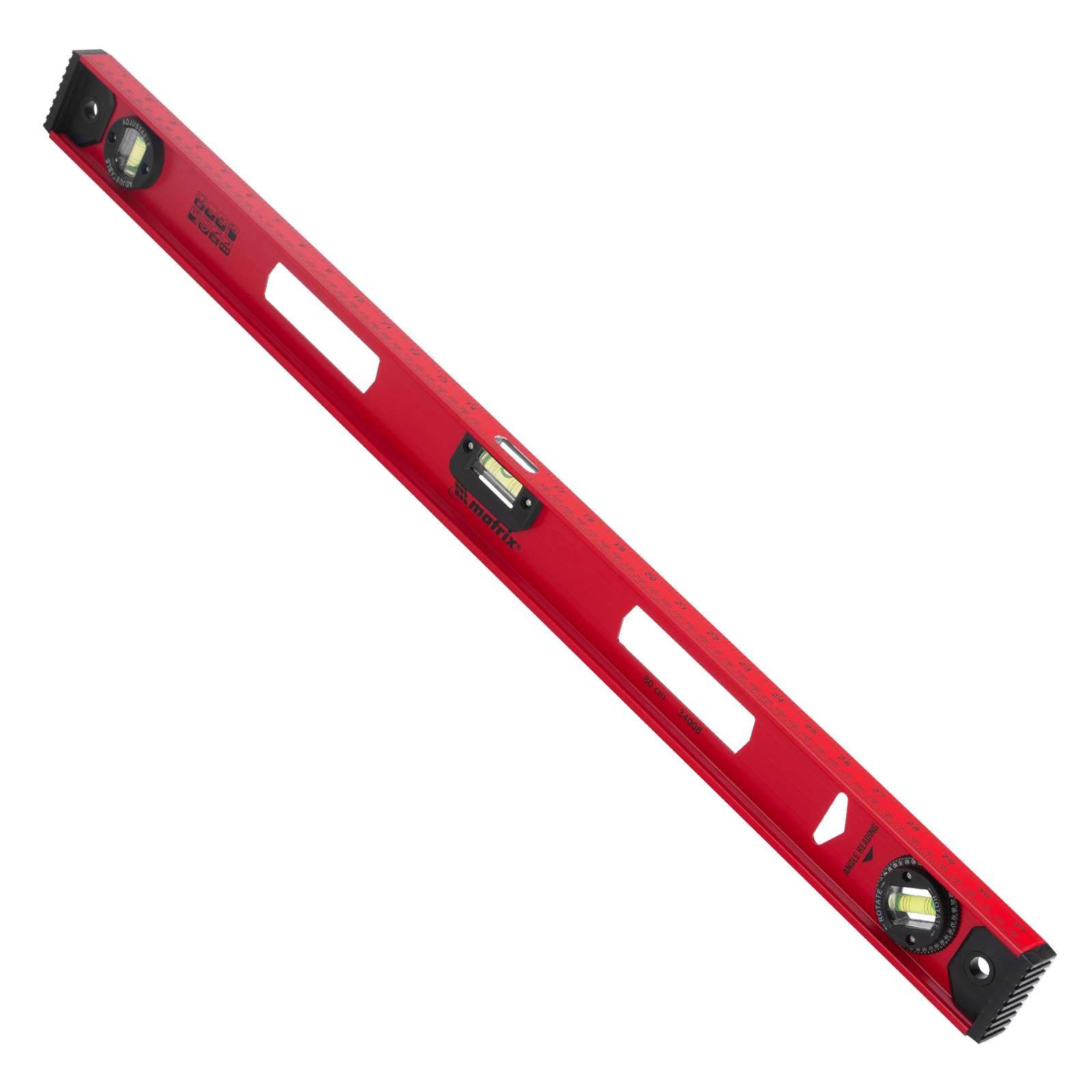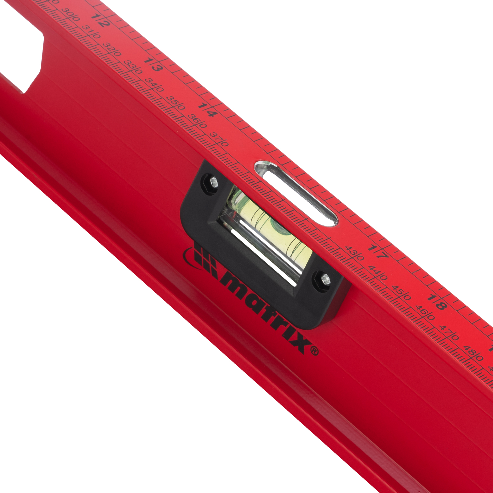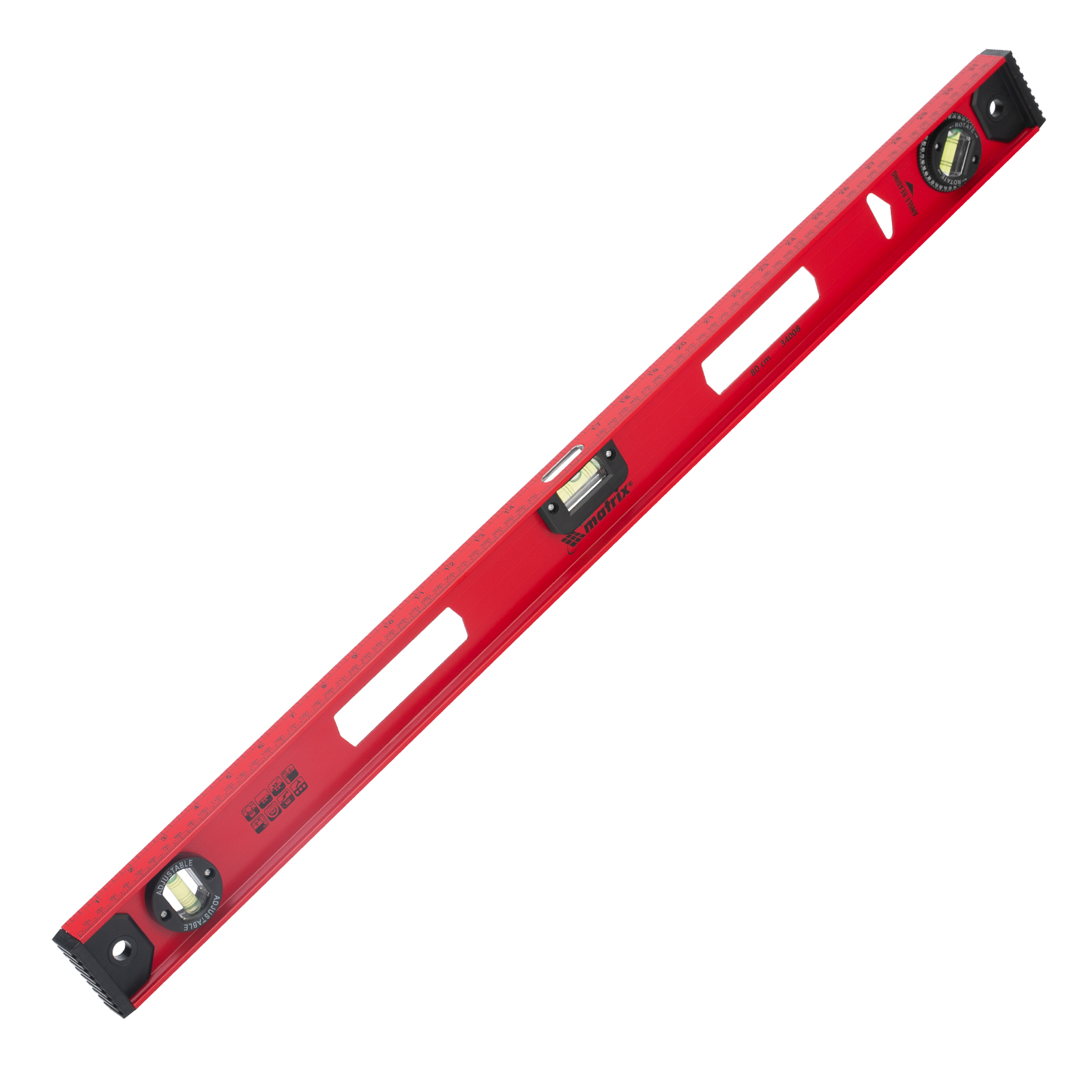 Уровень алюминиевый усиленный Matrix «Рельс» 34008 длиной 800 мм снабжен 3 глазками для проверки отклонений относительно горизонтальной и вертикальной плоскостей. Поворотный глазок уровня позволяет выстроить произвольный угол. Инструмент пригодится строителю, отделочнику, бетонщику и другим специалистам.