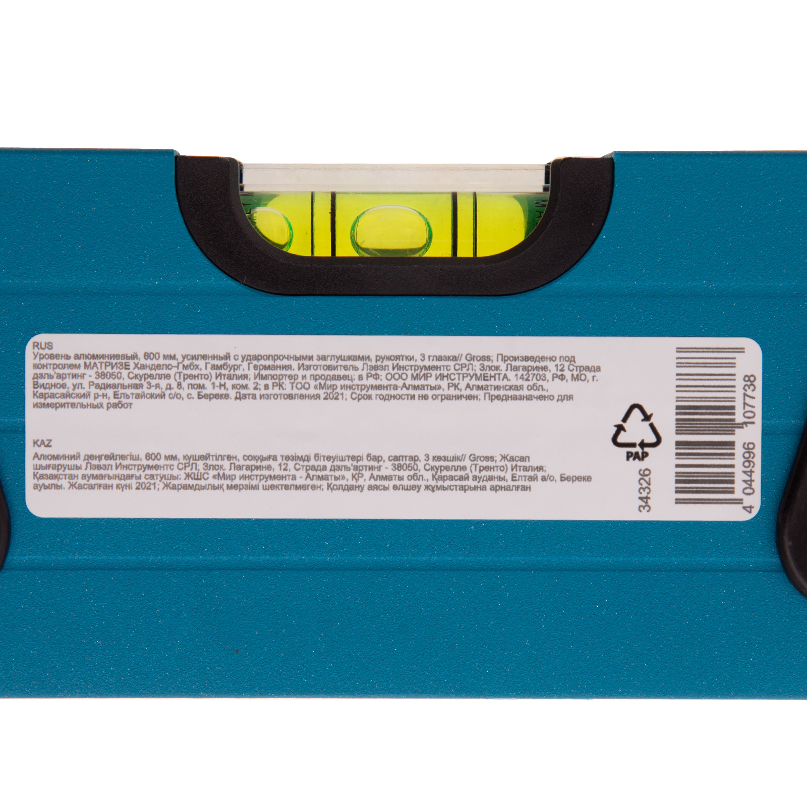 Уровень алюминиевый, 600 мм, усиленный с ударопрочными заглушками, рукоятки, 3 глазка Gross в Уфе
