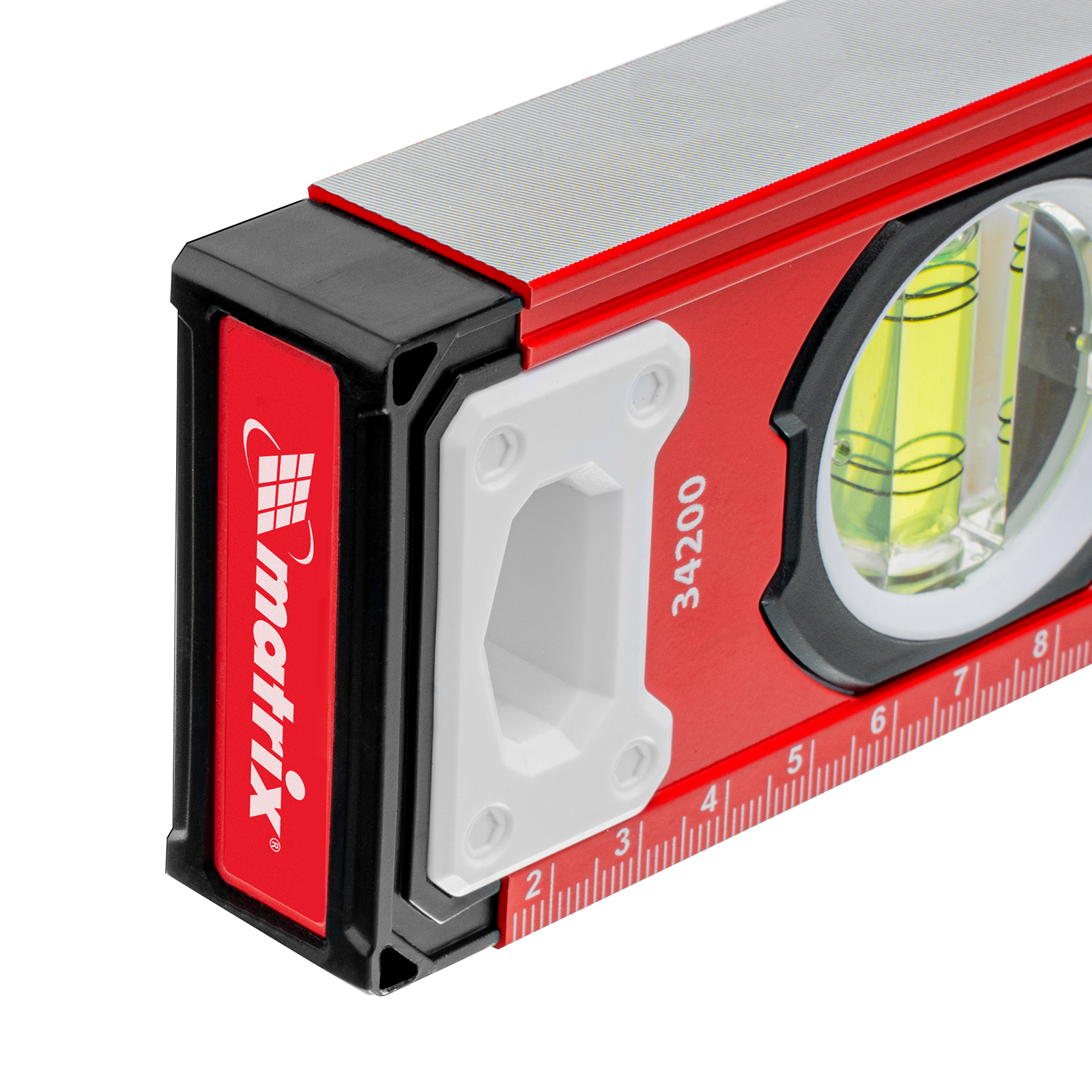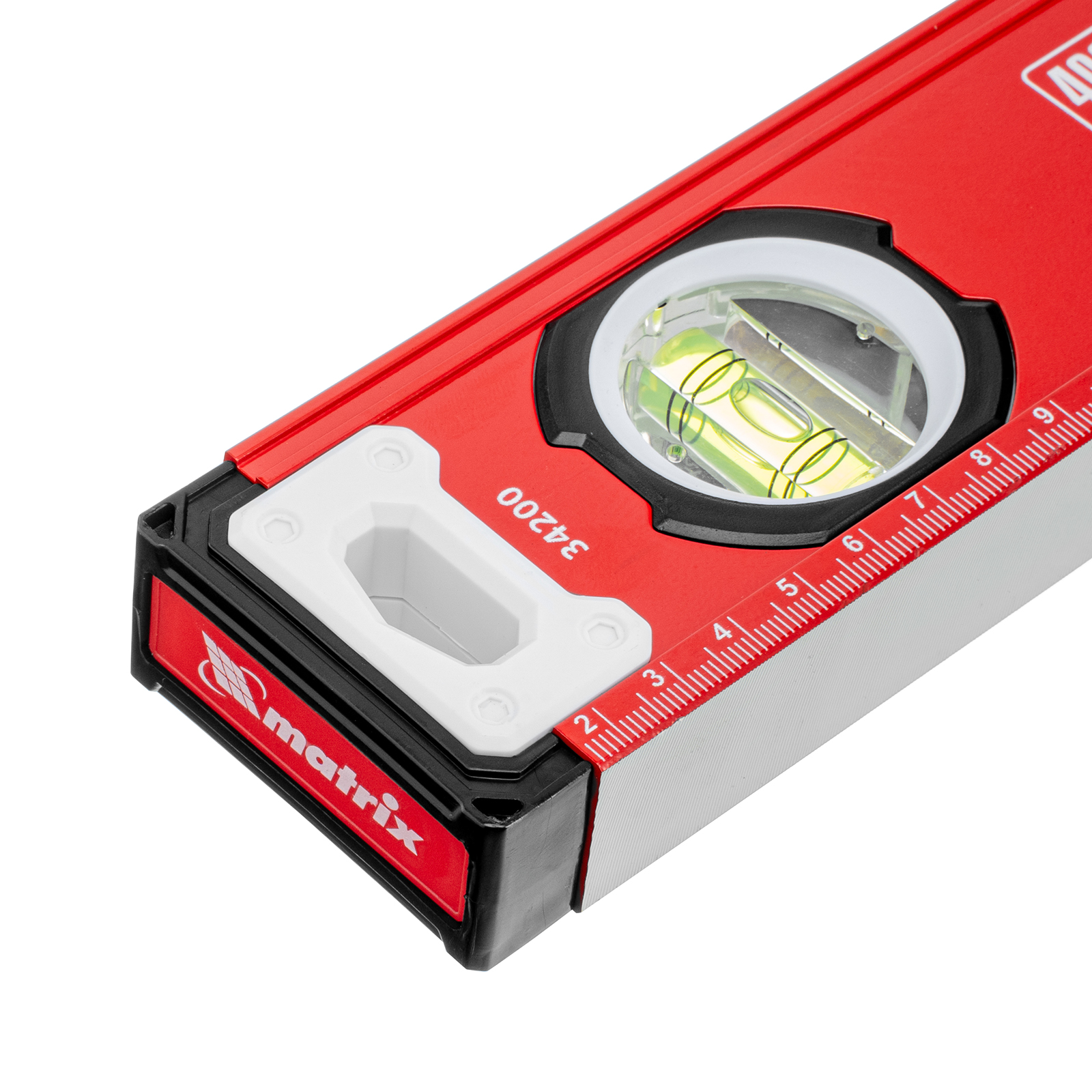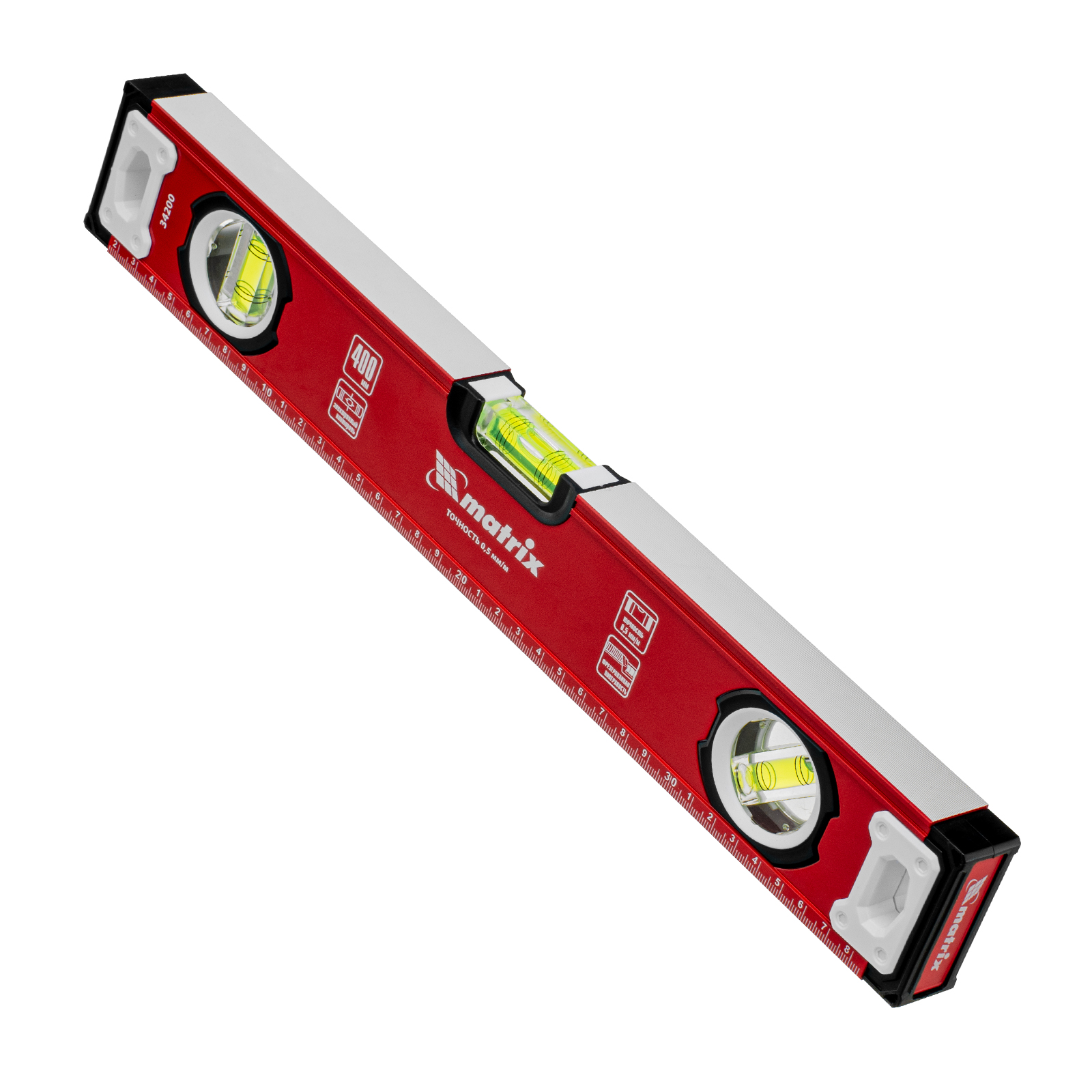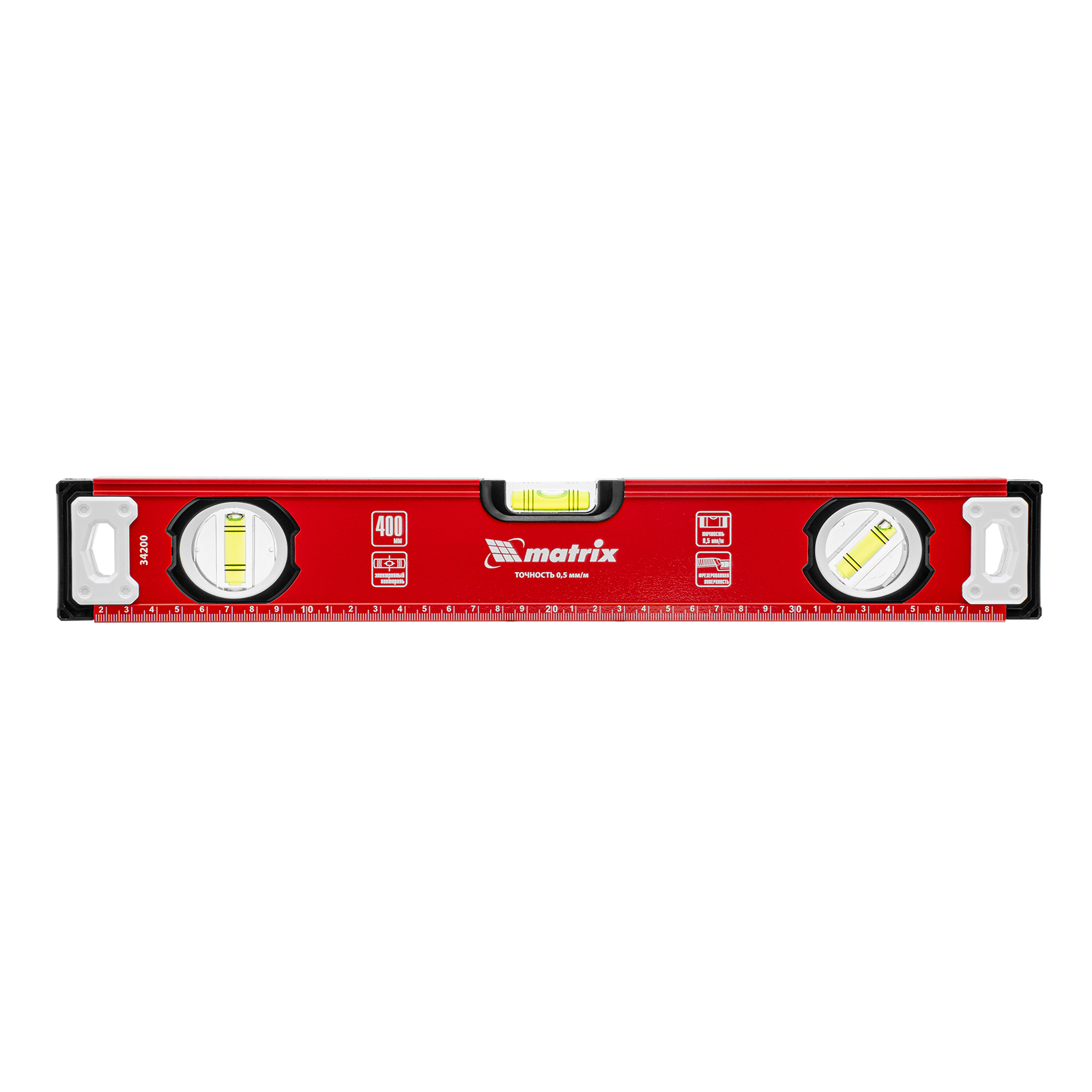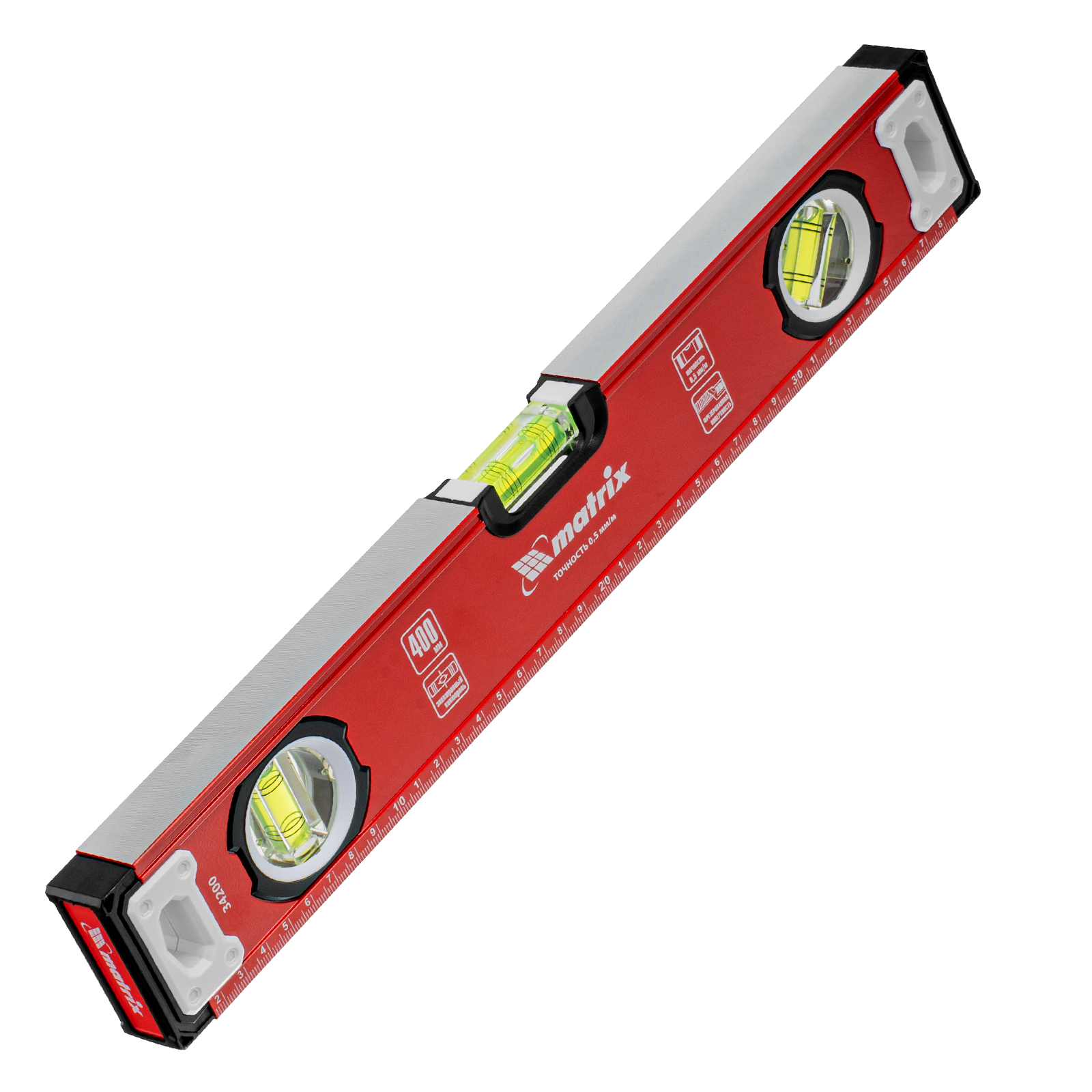 Уровень алюминиевый фрезерованный Matrix 34200 длиной 400 мм, с 3 глазками, предназначен для определения отклонений от горизонтальной и вертикальной поверхностей и угла 45°. Обеспечивает высокую точность полученных результатов, пригодится для выполнения строительных и отделочных работ.