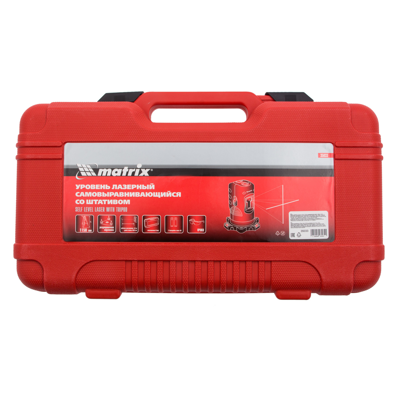 Самовыравнивающийся лазерный уровень Matrix 35033 размером 150 мм, поставляющийся в наборе со штативом 1150 мм в пластиковом кейсе, выстраивает проекции на плоскости: горизонталь, вертикаль или две сразу в виде креста. Инструмент облегчает проведение ремонтных, строительных, монтажных работ, декорирование помещений. Максимальная дальность проекции составляет 10 м, а лазерный луч одинаково хорошо виден в светлое и темное время суток, в помещениях и на улице.