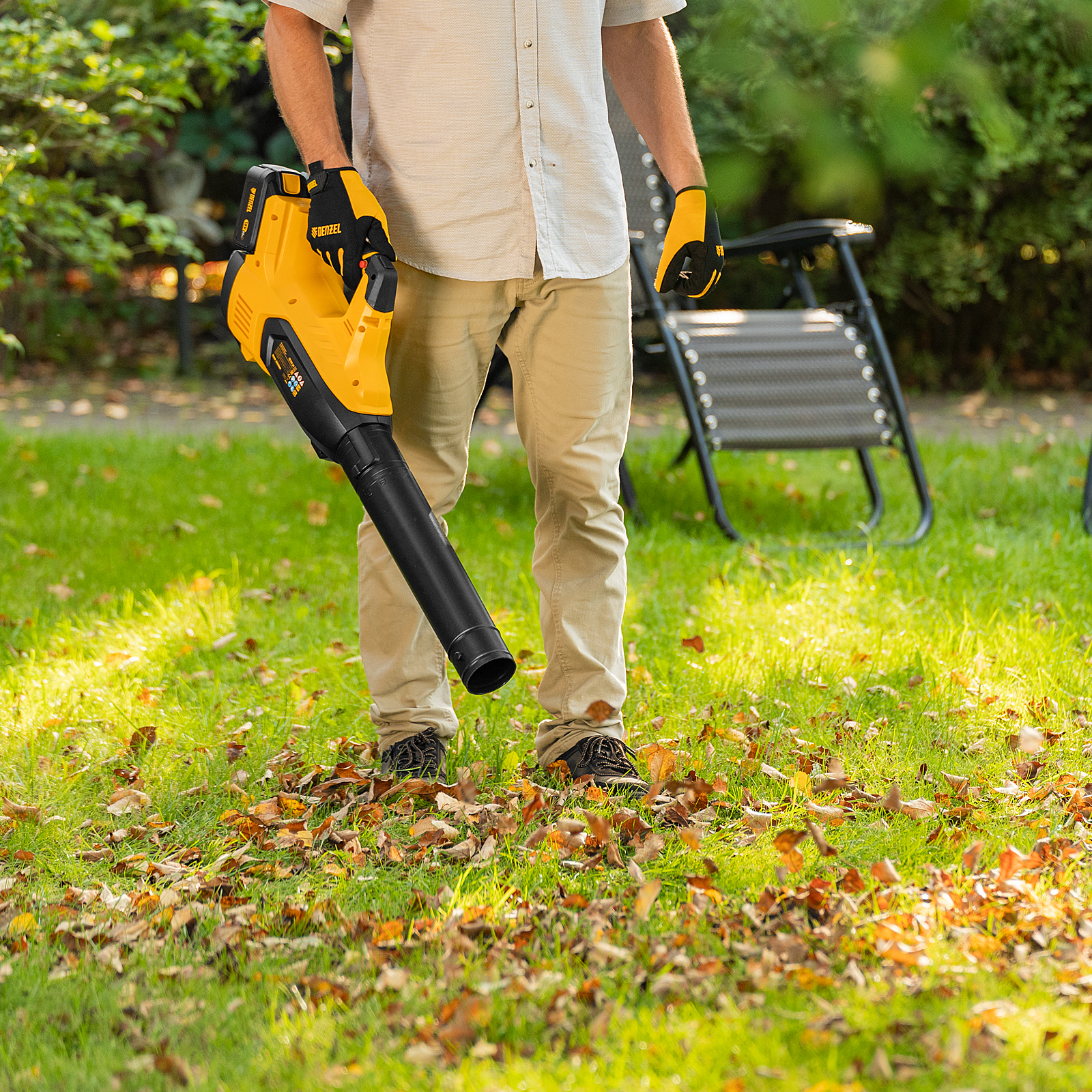 Аккумуляторная воздуходувка Denzel RB180-36 59610 производительностью 820 куб. м/ч предназначена для очистки придомовых территорий от опавшей листвы, скошенной травы и опилок. Высокая скорость воздушного потока 180 км/ч обеспечивает эффективную работу и позволяет убирать также мелкий строительный мусор и небольшие ветки.,Благодаря аккумуляторам Li-ion общим напряжением 36 В и емкостью 4 Ач можно работать в любом месте вне зависимости от наличия электросети. Воздуходувка не выделяет вредных выхлопов и не требует сложного технического обслуживания, что делает ее использование максимально удобным и безопасным.