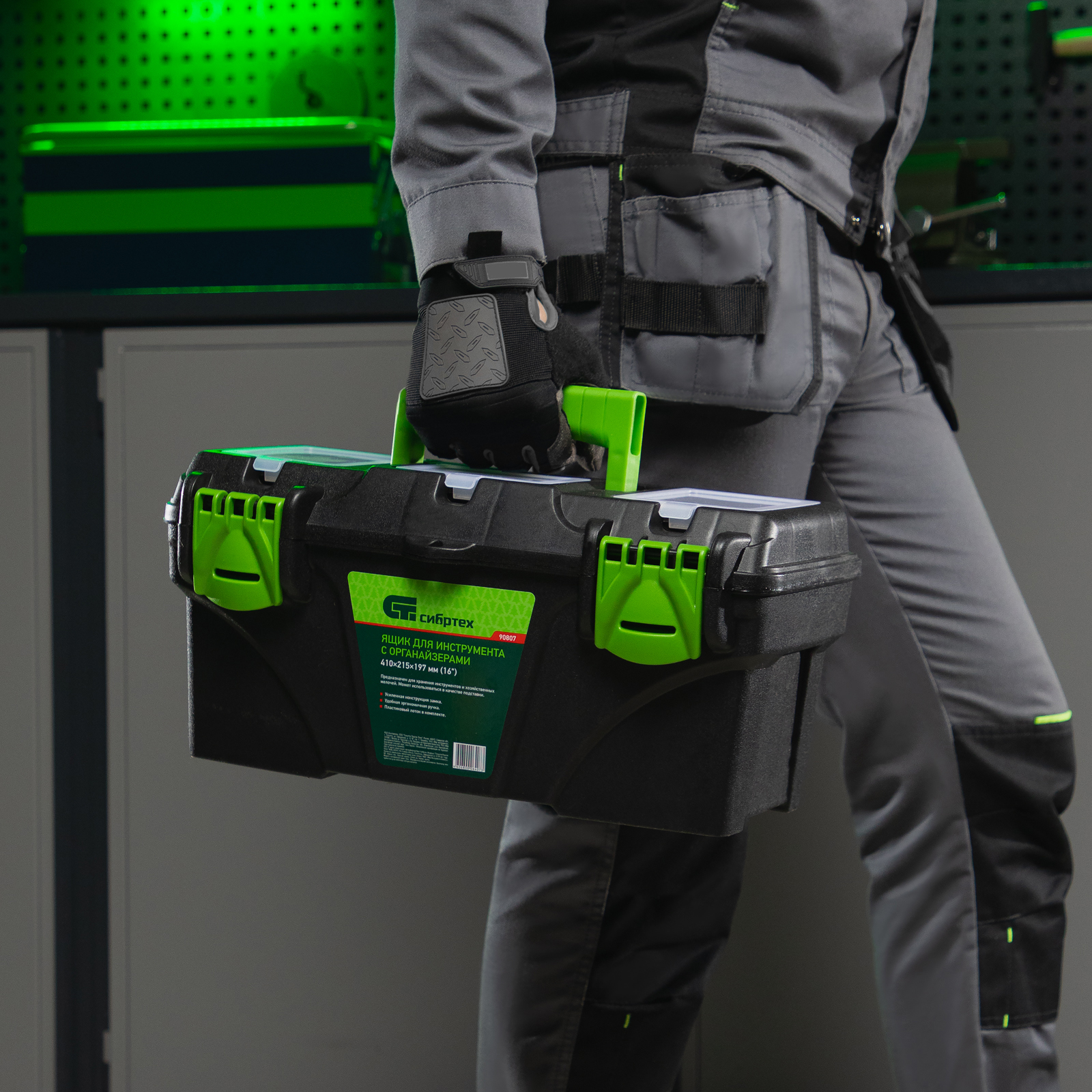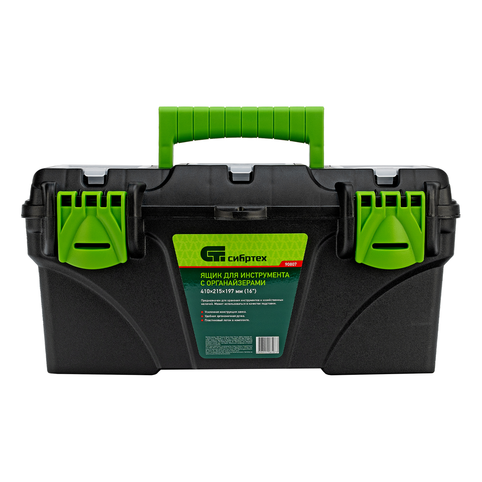 Ящик Сибртех 90807 длиной 16", с органайзерами, используется для хранения и транспортировки инструментов, оснастки, крепежа, хозяйственных мелочей и других предметов. Крышка и замок усилены трехрядными петлями, поэтому ящик выдерживает вес содержимого до 30 кг. Съемный лоток позволяет оптимизировать пространство внутри ящика. Его можно брать в поездку, также он пригодится дома, на даче или в гараже.