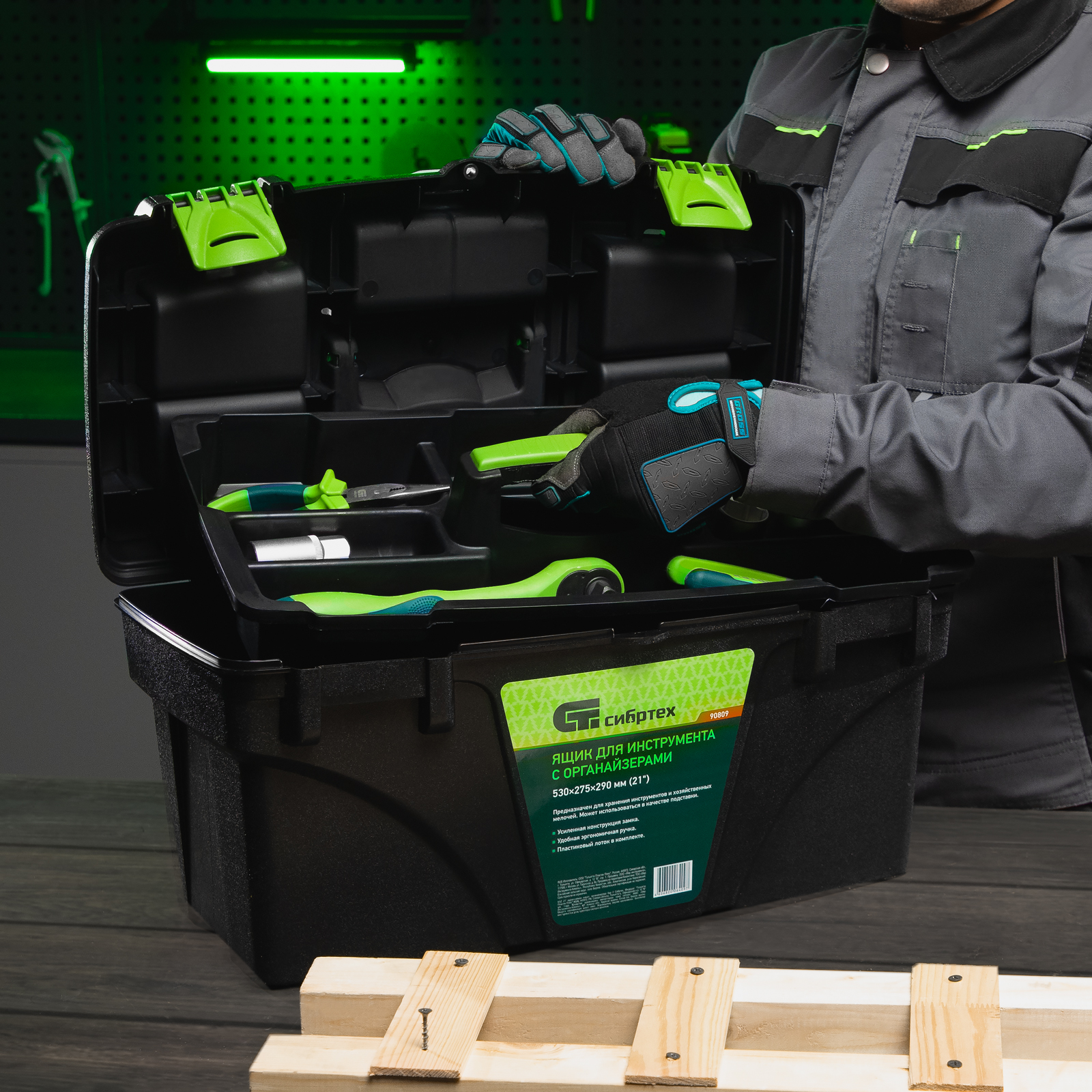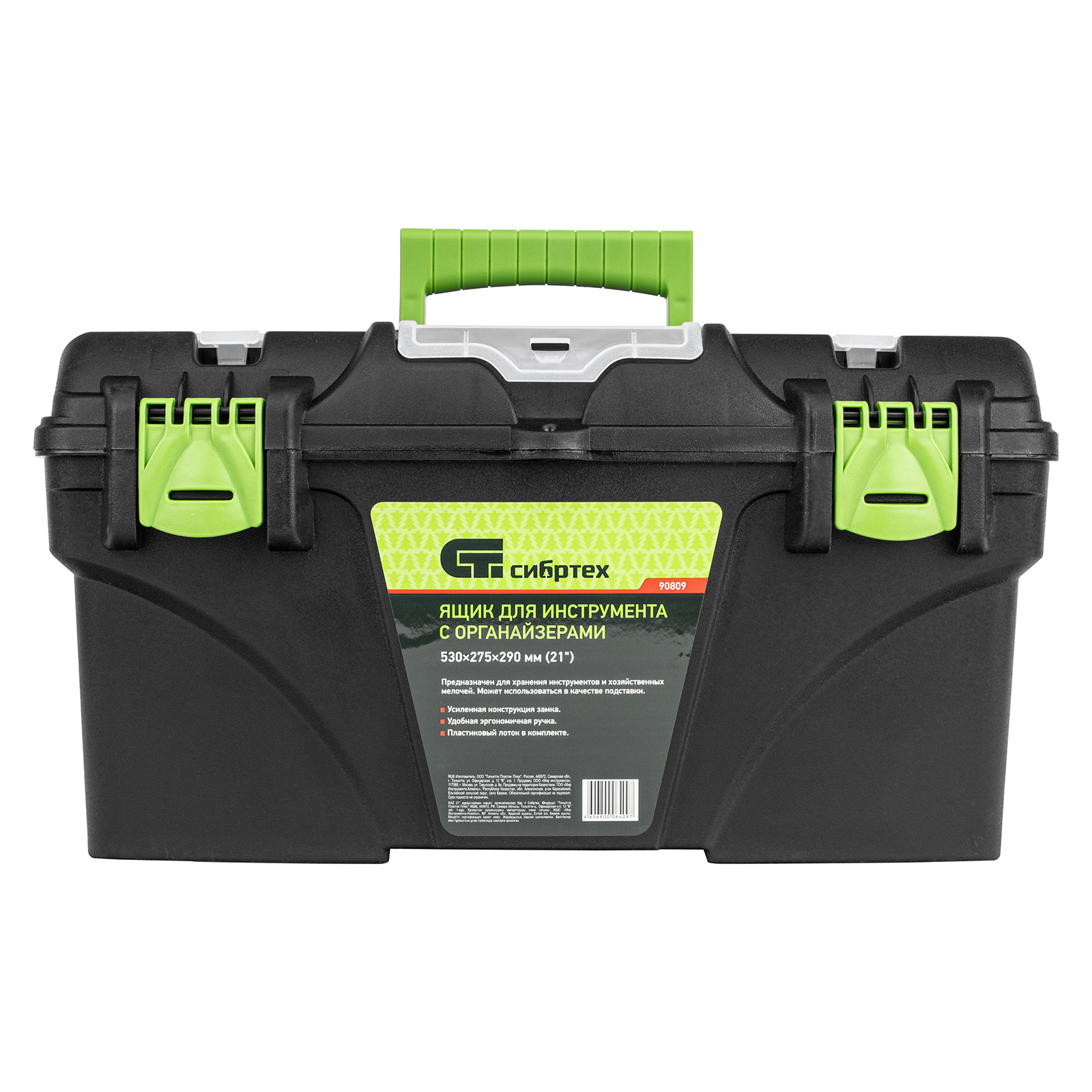 Ящик Сибртех 90809 длиной 21", с органайзерами, используется для хранения и транспортировки инструментов, оснастки, крепежа, хозяйственных мелочей и других предметов. Крышка и замок усилены трехрядными петлями, поэтому ящик выдерживает вес содержимого до 50 кг. Съемный лоток позволяет оптимизировать пространство внутри ящика. Его можно брать в поездку, также он пригодится дома, на даче или в гараже.